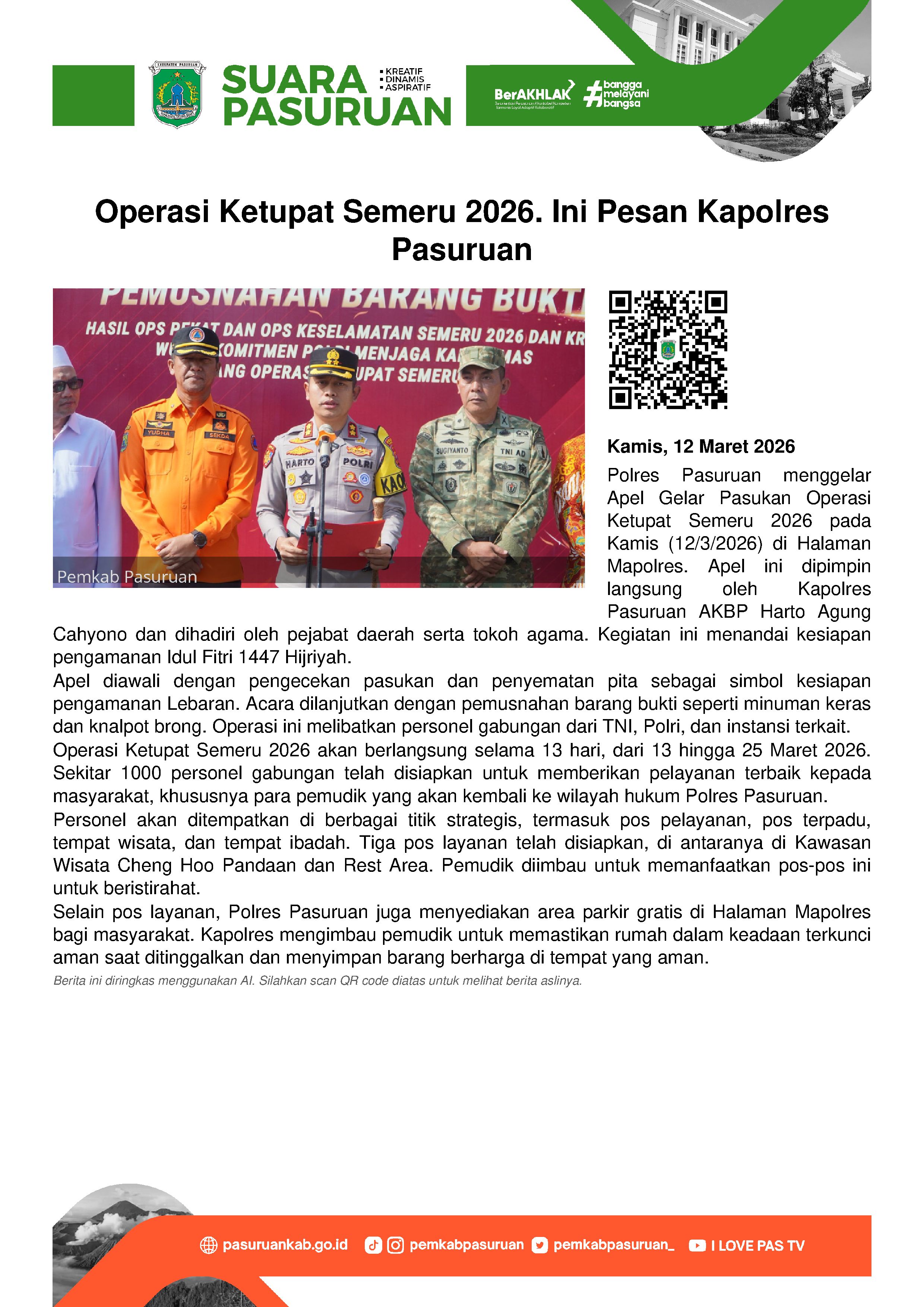 Polres Pasuruan melaksanakan Apel gelar pasukan operasi kepolisian terpusat Ketupat Semeru 2026, Kamis (12/3/2026) pagi.