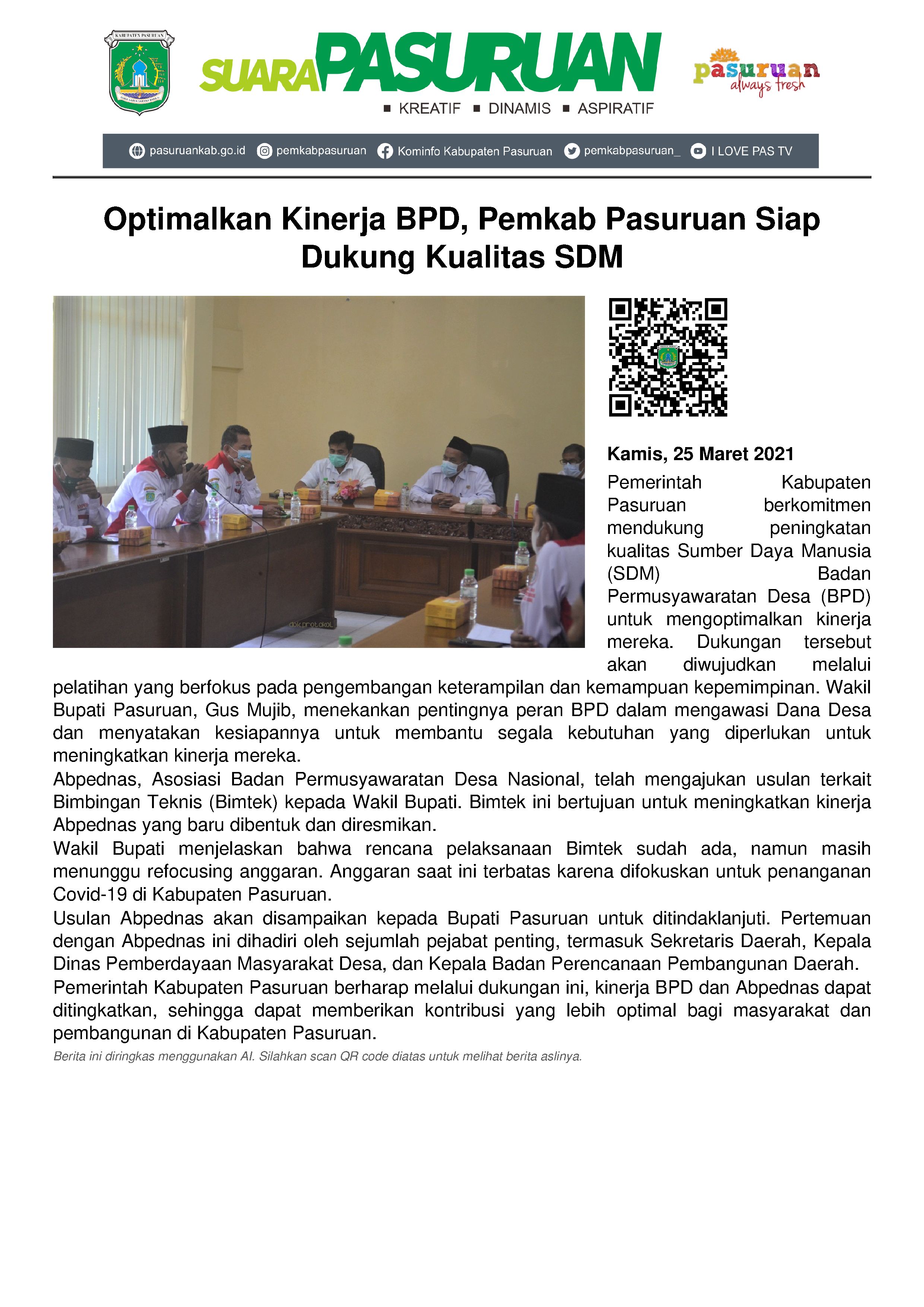Agar kinerja Badan Permusyawaratan Desa (BPD) lebih optimal, Pemerintah Kabupaten Pasuruan siap mendukung dari sisi peningkatan kualiatas Sumber Daya Manusia (SDM). Diantaranya dilakukan melalui penyelenggaraan pelatihan yang bersifat training empowering leader atau pelatihan pengembangan ketrampilan dan kemampuan. Pernyataan itu disampaikan Gus Mujib sapaan familiar Wakil Bupati Pasuruan pada saat menerima kunjungan dari Asosiasi Badan Permusyawaratan Desa Nasional (Abpednas), Rabu (24/3/2021).