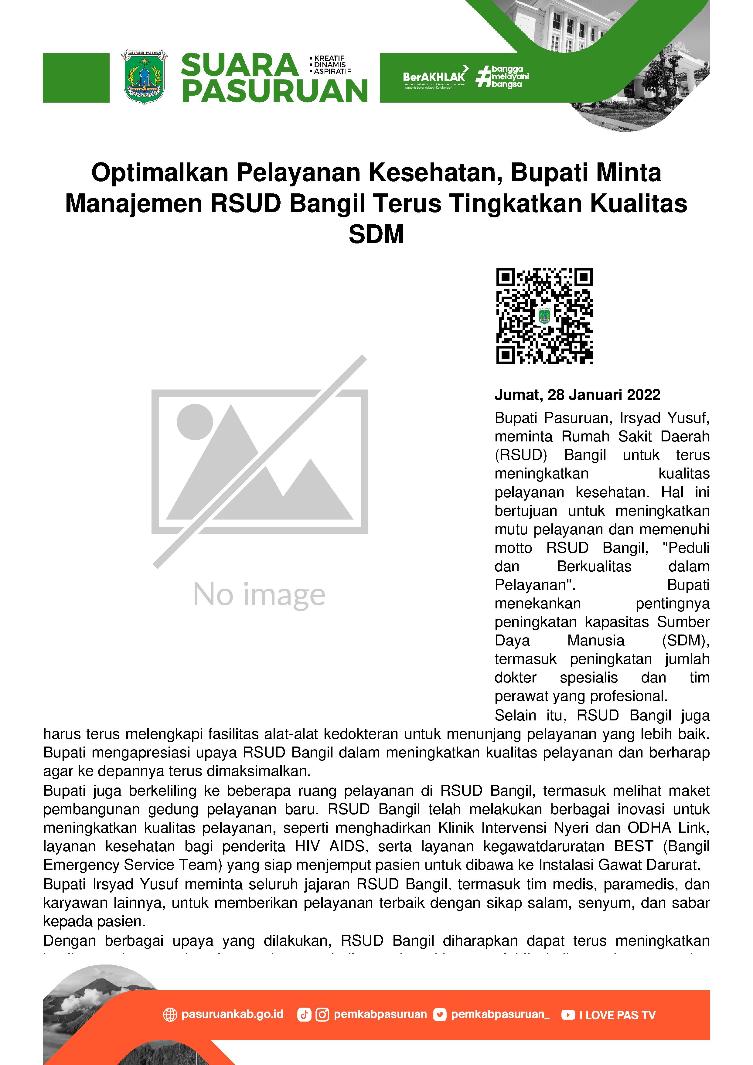Kata Bupati Irsyad Yusuf, tujuannya tidak lain untuk meningkatkan mutu pelayanan. Dalam forum bersifat evaluatif terhadap kinerja seluruh jajaran penyelenggara fasilitas pelayanan kesehatan milik Pemerintah Kabupaten Pasuruan tersebut, Kepala Daerah juga menggarisbawahi beberapa hal. Bahwa peningkatan kualitas pelayanan harus dilakukan oleh seluruh jajaran semaksimal mungkin, Tidak hanya berlaku bagi tim medis dan paramedis saja, melainkan juga segenap karyawan RSUD Bangil.