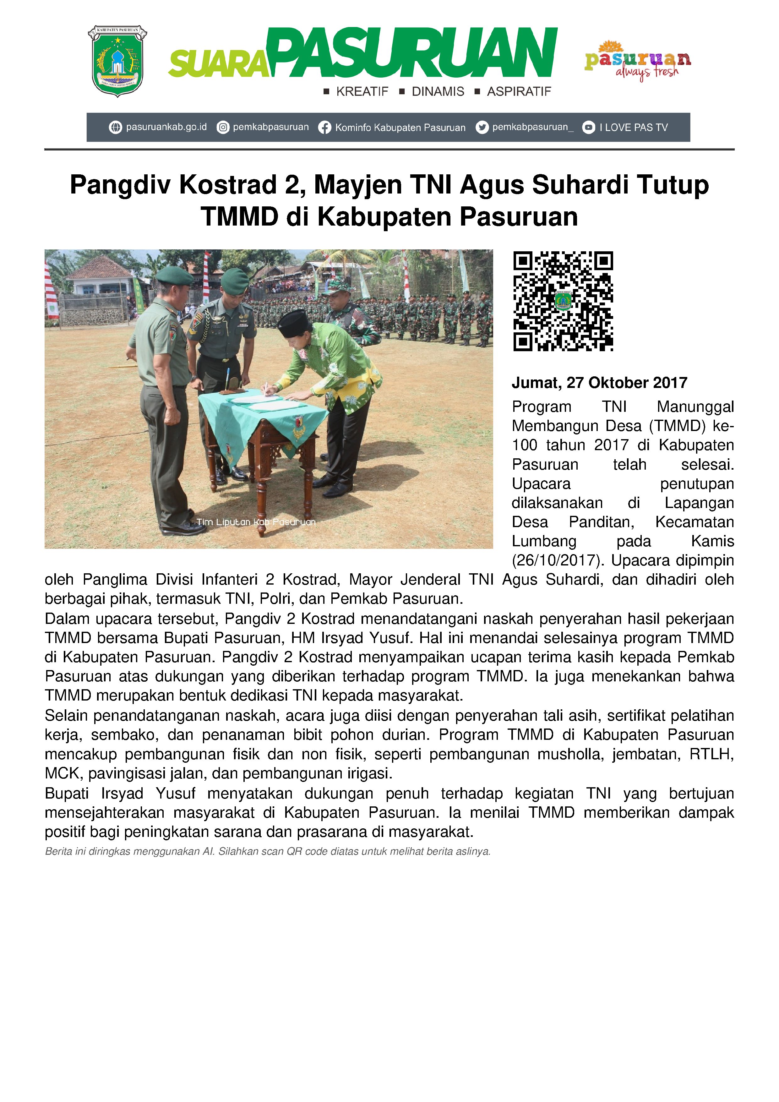 “Banyak sekali desa-desa yang menjadi tujuan TMMD semakin baik, dan makin meningkat kesejahteraannya, salah satunya di Kabupaten Pasuruan,” imbuhnya.