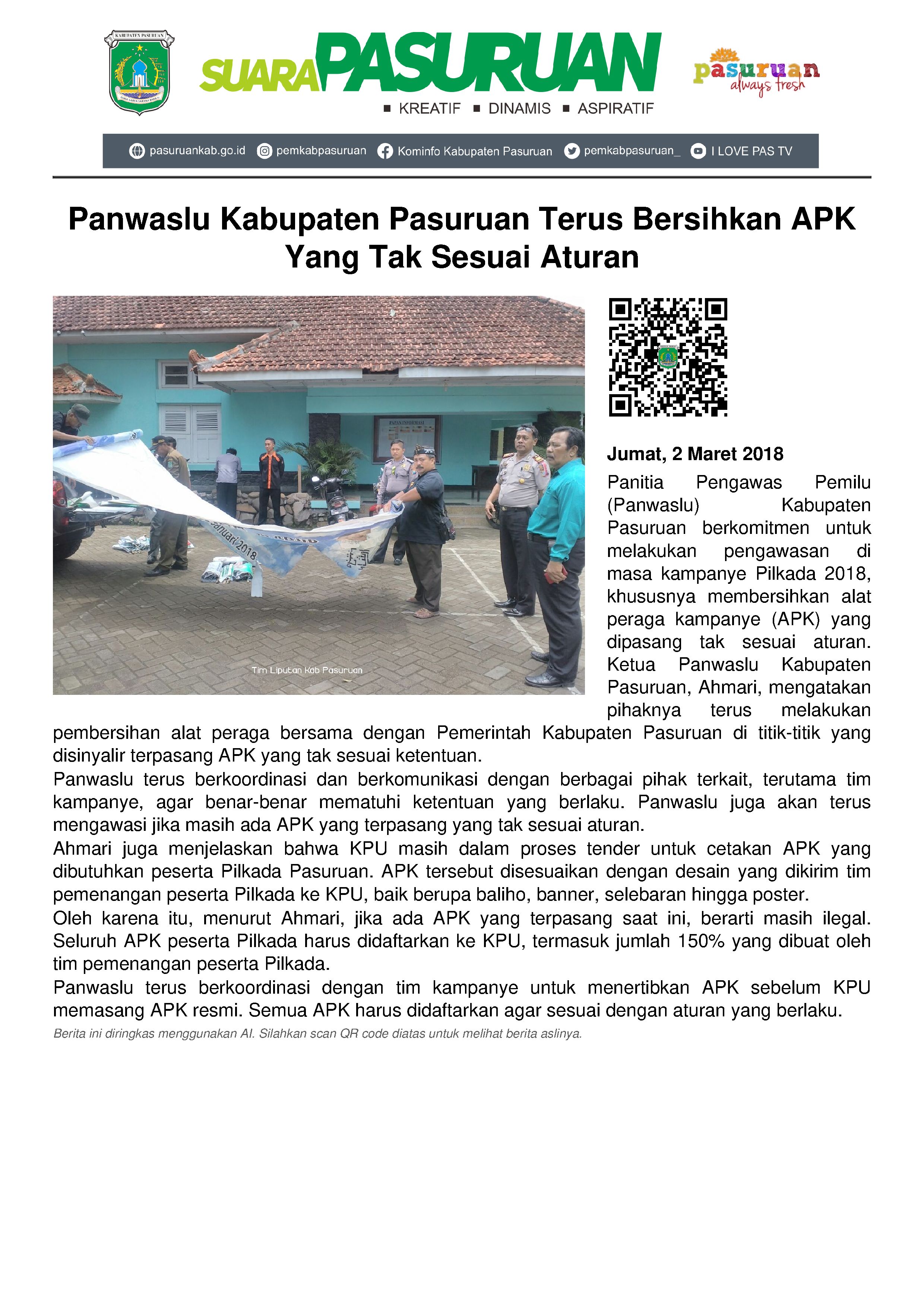 Ketua Panwaslu Kabupaten Pasuruan, Ahmari mengatakan, pihaknya terus melakukan pembersihan alat peraga Bersama dengan Pemerintah Kabupaten Pasuruan, di titik-titik yang disinyalir terpasang APK yang tak sesuai ketentuan.