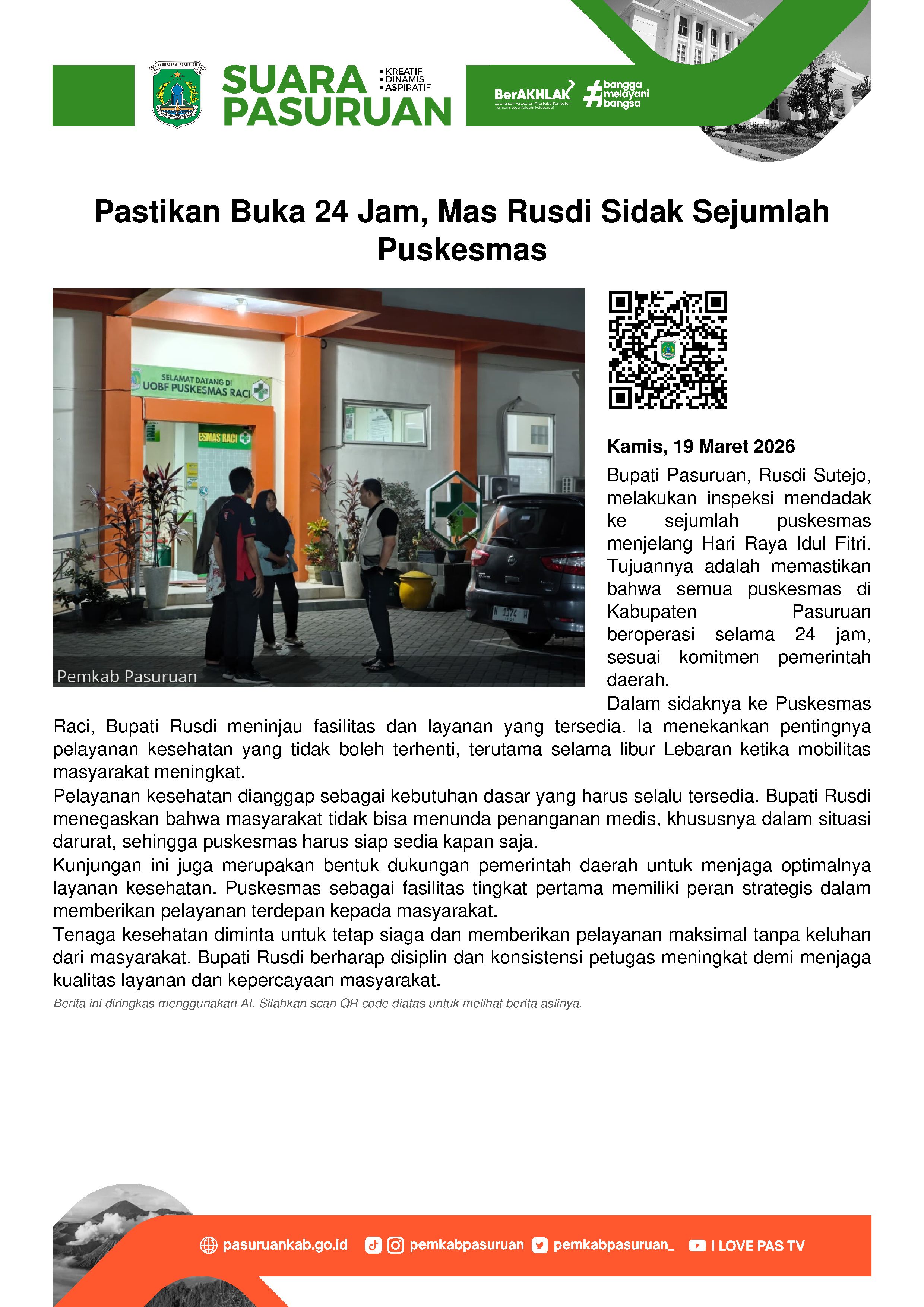 Seperti yang terlihat pada Rabu (18/3/2026) malam, Mas Rusdi - sapaan akrab Bupati Pasuruan ini melakukan sidak ke Puskesmas Raci.