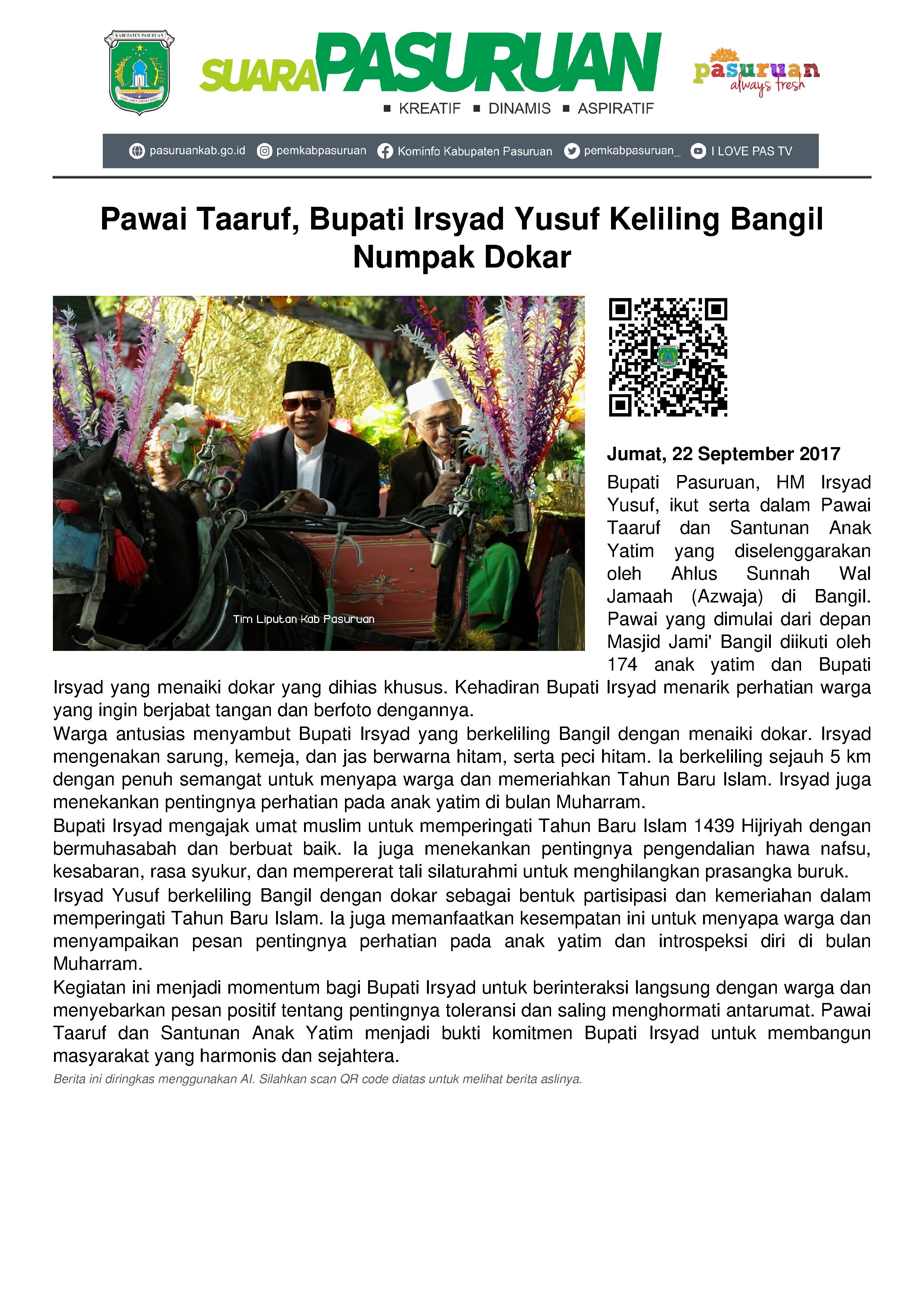 Dari pantauan di lapangan, pria yang akrab disapa Gus Irsyad itu berkeliling Bangil dengan menaiki dokar, dan memakai sarung, kemeja serta jas berwarna hitam. Tak ketinggalan, peci hitam selalu menemaninya ke manapun Irsyad pergi. Rute sejauh 5 km pun dilalui Irsyad dengan penuh semangat. Selain ingin menyapa warga, Irsyad juga ingin menyemarakkan Tahun Baru Islam dengan semeriah mungkin.