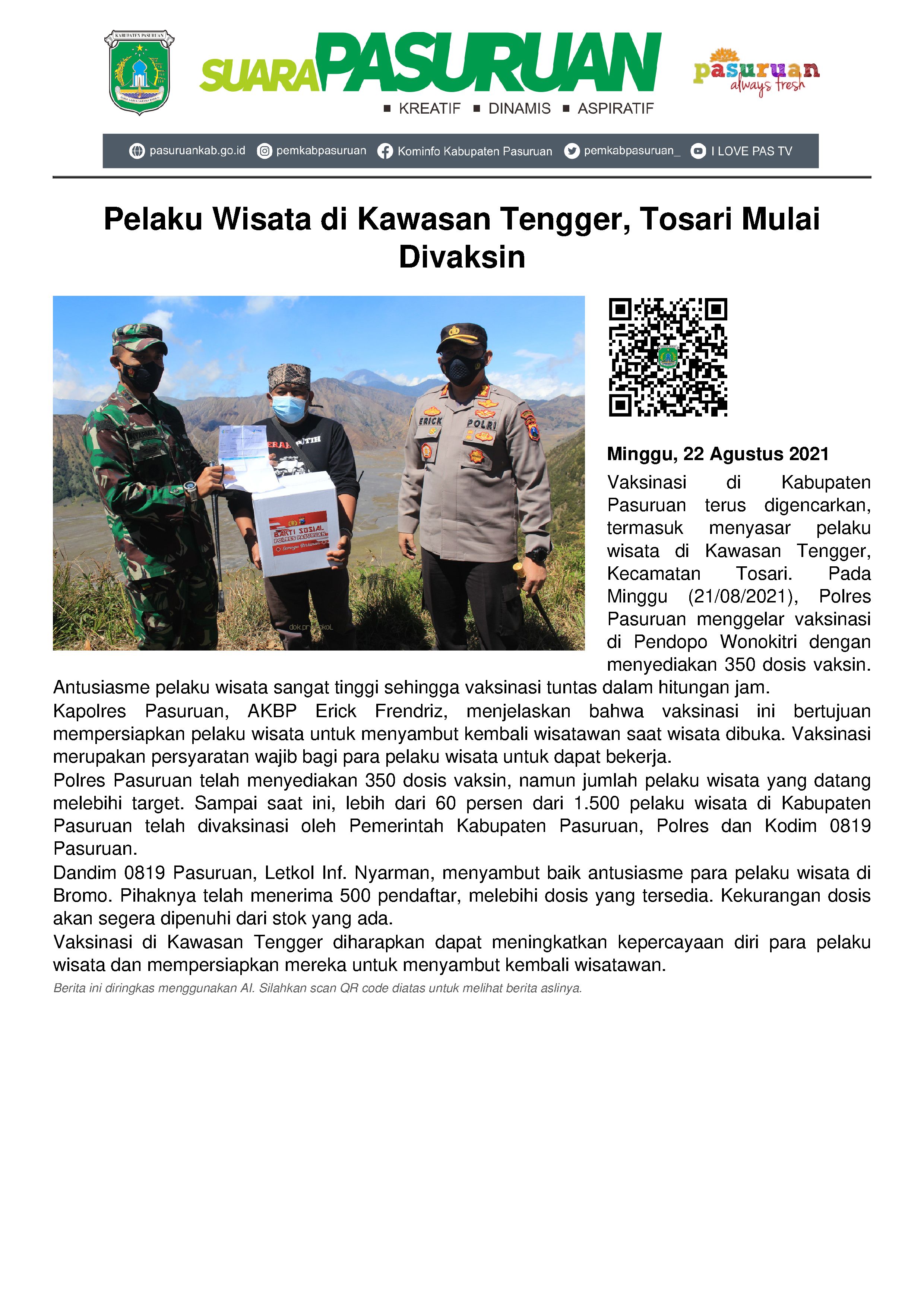 Terpisah, Dandim 0819 Pasuruan, Letkol Inf. Nyarman menyambut baik respon para pelaku wisata di Bromo. Sebab, mereka sangat antusias dalam mengikuti program vaksinasi yang ada. Pihaknya mengaku, sudah ada 500 orang yang mendaftar. Padahal dosis yang disediakan awalnya hanya 350.