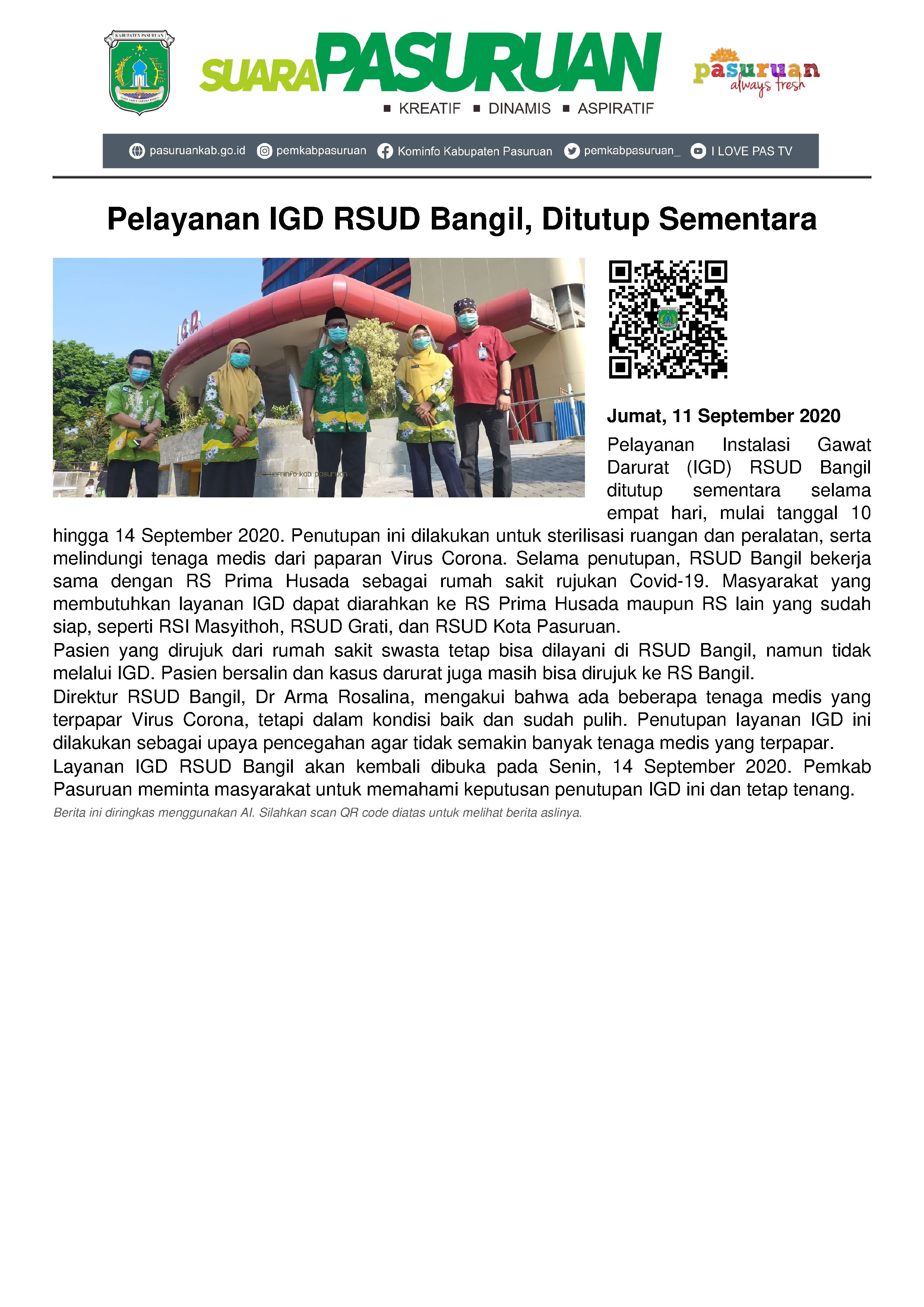Sekretaris Daerah (Sekda) Kabupaten Pasuruan, Anang Saiful Wijaya mengatakan, penutupan pelayanan IGD RSUD Bangil diberlakukan hanya selama 4 hari saja. Yakni mulai 10-14 September 2020.