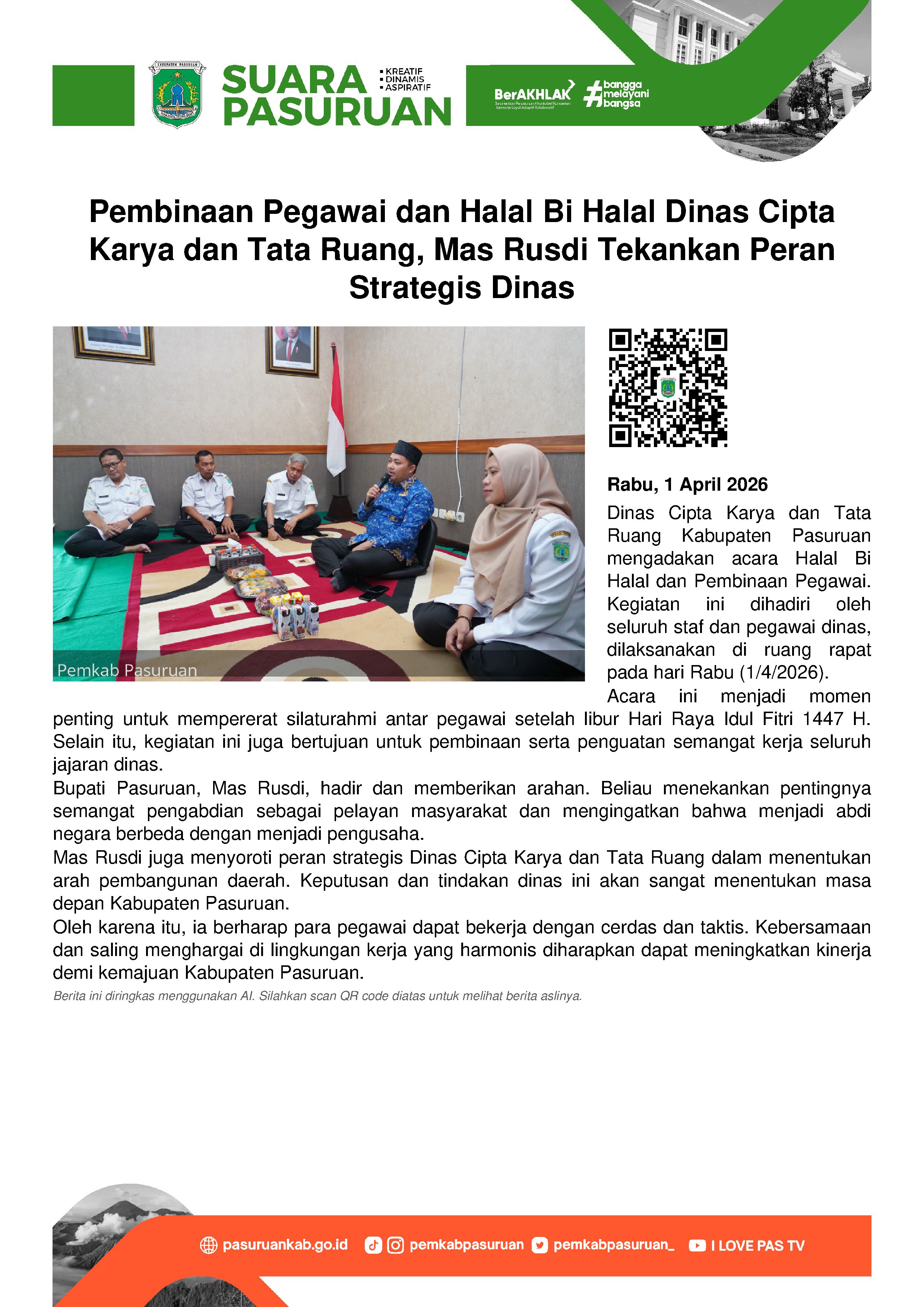Dinas Cipta Karya dan Tata Ruang Kabupaten Pasuruan melaksanakan kegiatan Halal Bi Halal sekaligus Pembinaan Pegawai yang dihadiri oleh seluruh staf dan pegawai di lingkungan Dinas Cipta Karya dan Tata Ruang. Kegiatan tersebut dilaksanakan di ruang rapat Dinas Cipta Karya dan Tata Ruang pada pagi ini, Rabu (1/4/2026).
