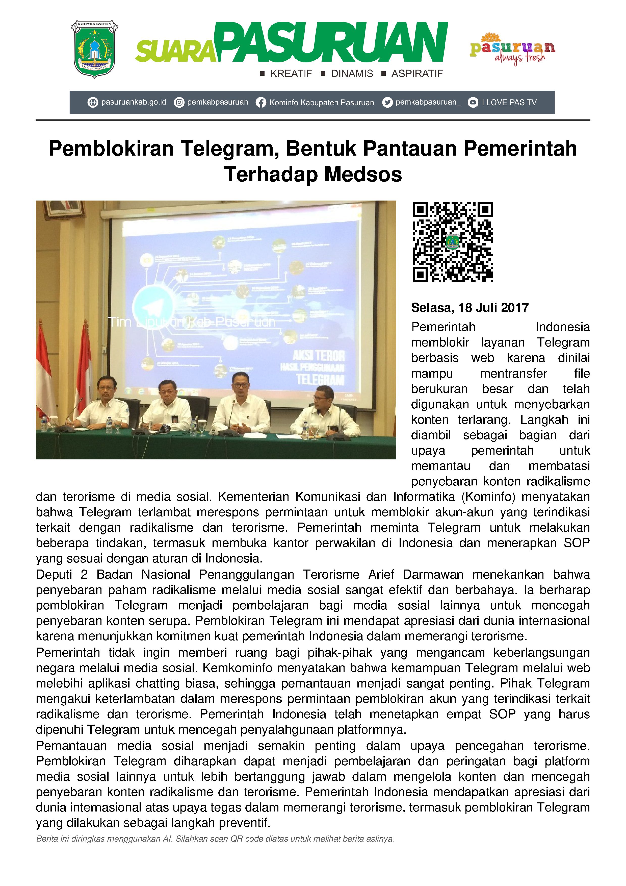 Sementara itu, Deputi 2 Badan Nasional Penanggulangan Terorisme Arief Darmawan menegaskan, selama ini pihaknya terus berkoordinasi dan memantau media sosial yang memuat konten radikal. Menurutnya, jika konten itu dibiarkan akan berpotensi menjadi bahaya yang luar biasa. Seharusnya, pemblokiran Telegram dapat menjadi pembelajaran dan peringatan bagi media sosial lainnya.