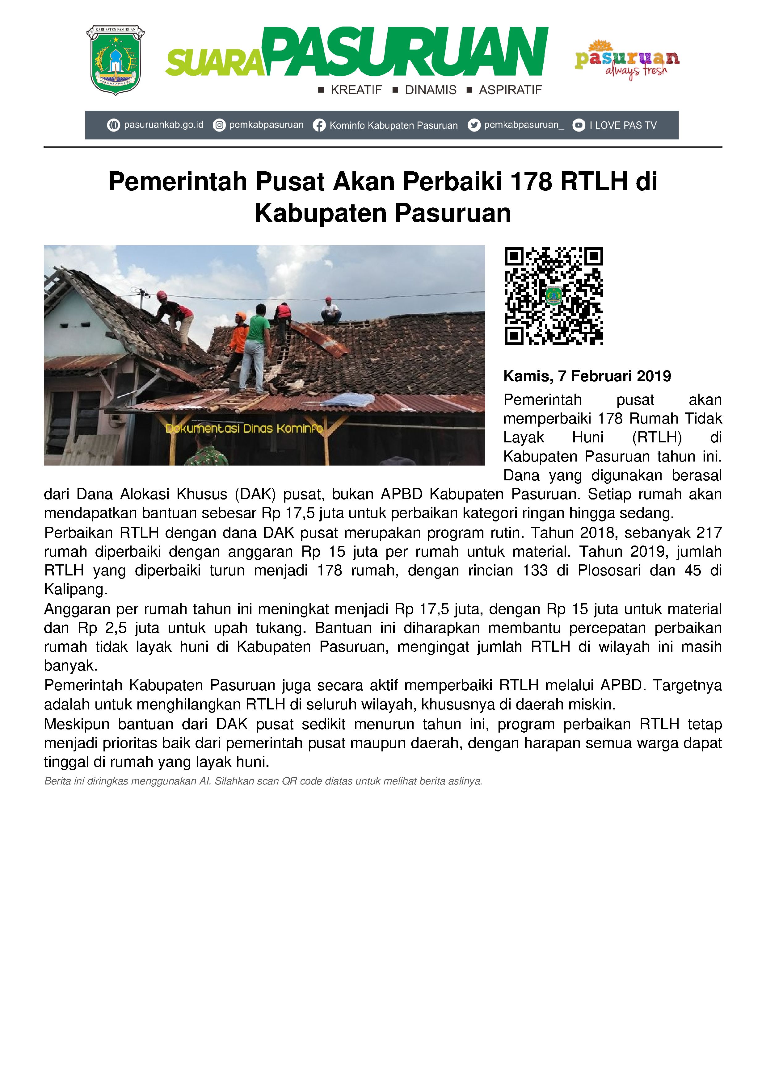Dengan bantuan perbaikan RTLH dari DAK pusat, otomatis cukup membantu percepatan perbaikan rumah tidak layak huni di Kabupaten Pasuruan. Ini lantaran terdata lebih dari 10 ribu rumah yang masih tergolong tidak layak huni di Kabupaten Pasuruan.