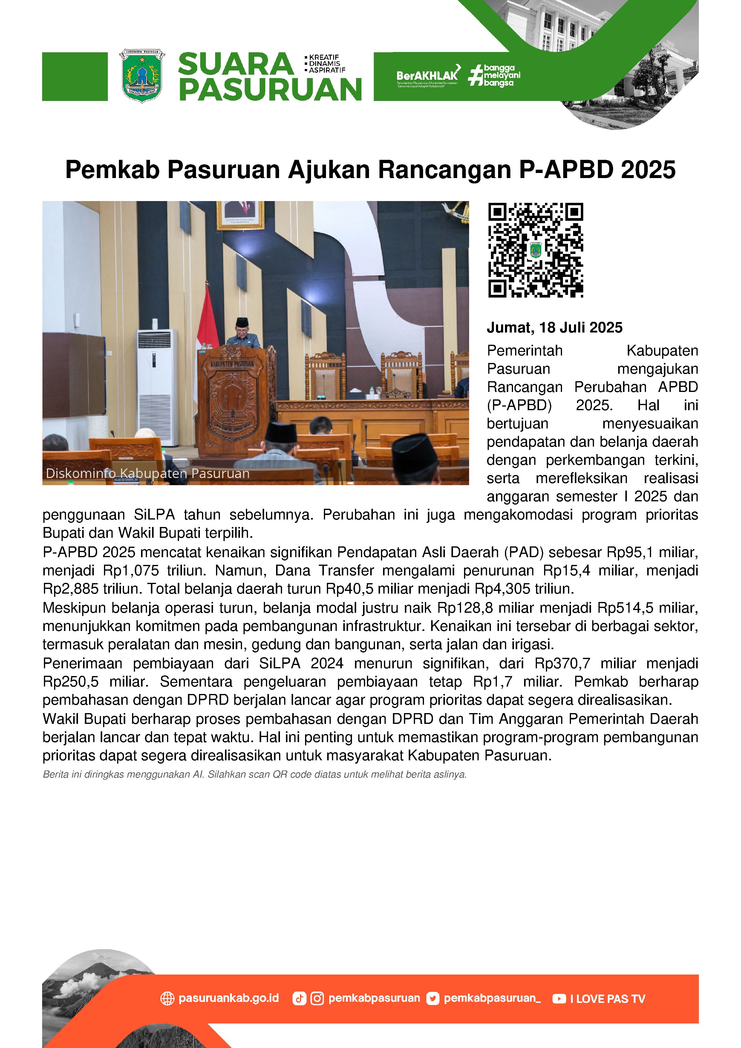 Pemerintah Kabupaten Pasuruan resmi mengajukan Rancangan Perubahan Anggaran Pendapatan dan Belanja Daerah (P-APBD) Tahun Anggaran 2025.