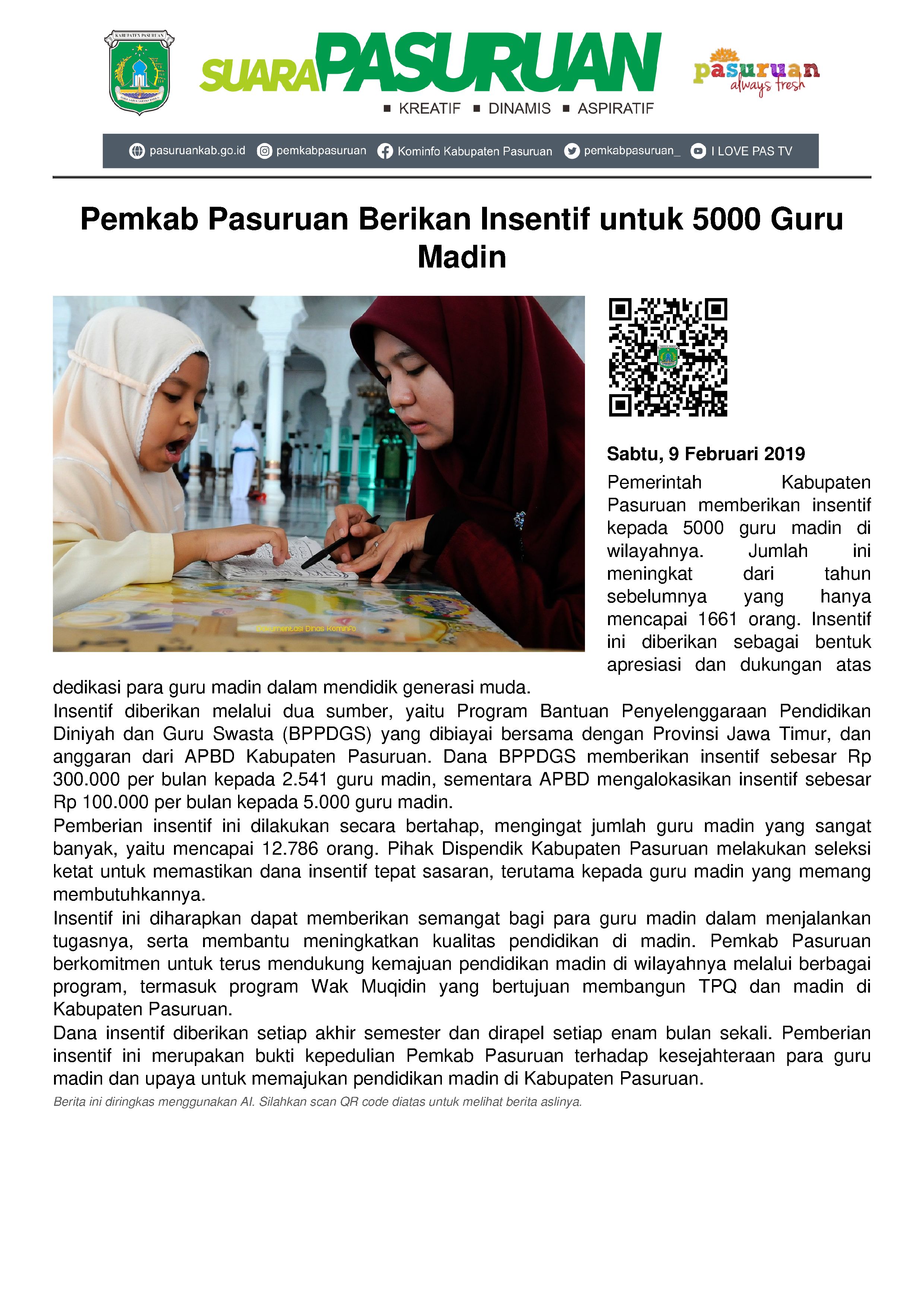 Tak hanya dana dari Program Bantuan Penyelenggaraan Pendidikan Diniyah dan Guru Swasta (BPPDGS) bersama Provinsi Jawa Timur, Pemerintah Kabupaten Pasuruan juga telah menyiapkan anggaran untuk insentif guru Madin.