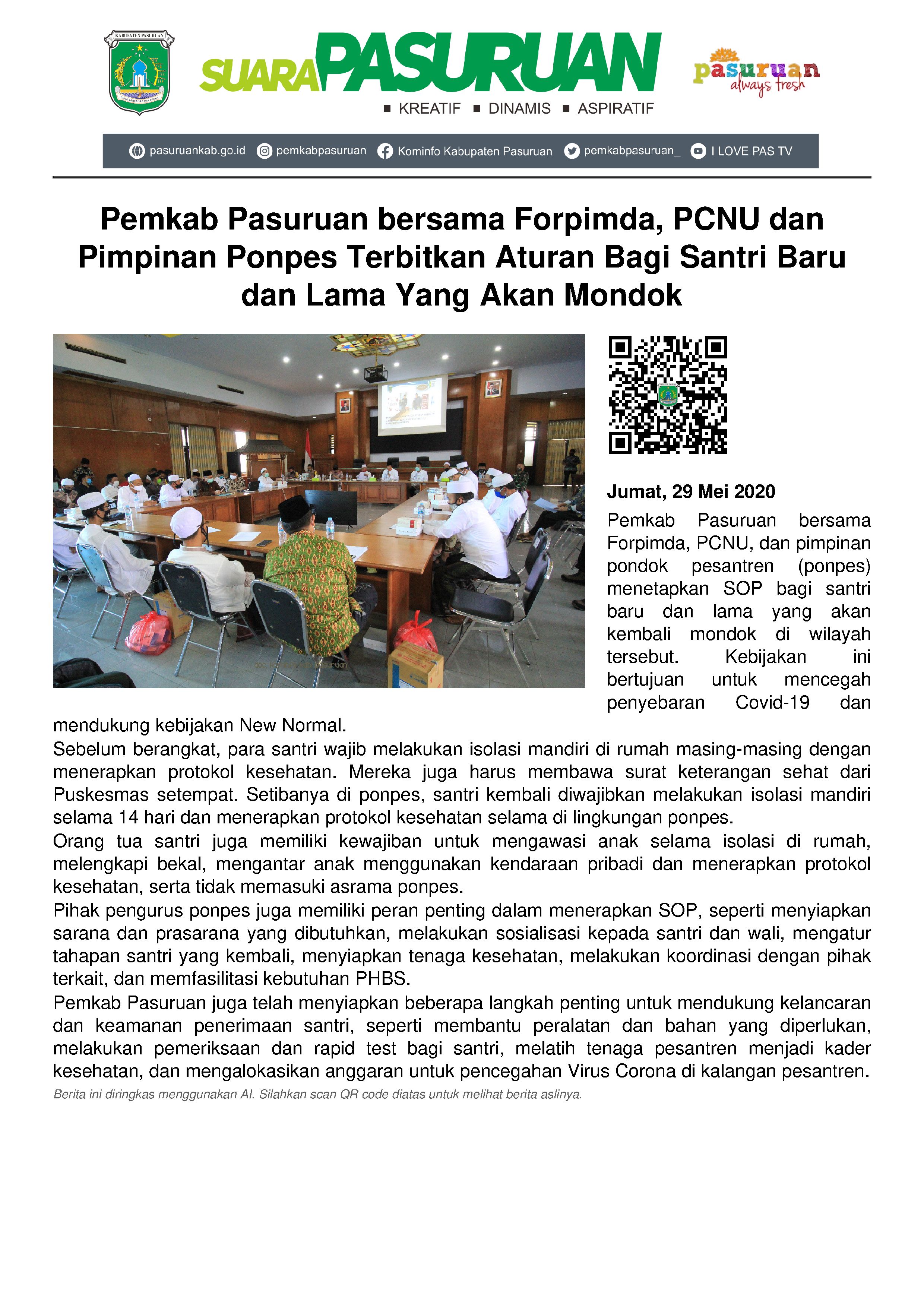 Pemerintah Kabupaten Pasuruan bersama Forpimda (Forum Pimpinan Daerah), PCNU (Pimpinan Cabang Nahdhatul Ulama), serta Pimpinan/ pengasuh/pemangku kebijakan Pondok Pesantren (Ponpes) menetapkan SOP (Standart Operasional Prosedur) bagi santri baru maupun santri lama yang akan kembali mondok di Ponpes se-Kabupaten Pasuruan. Termasuk untuk orang tua santri dan pengurus Ponpes itu sendiri.