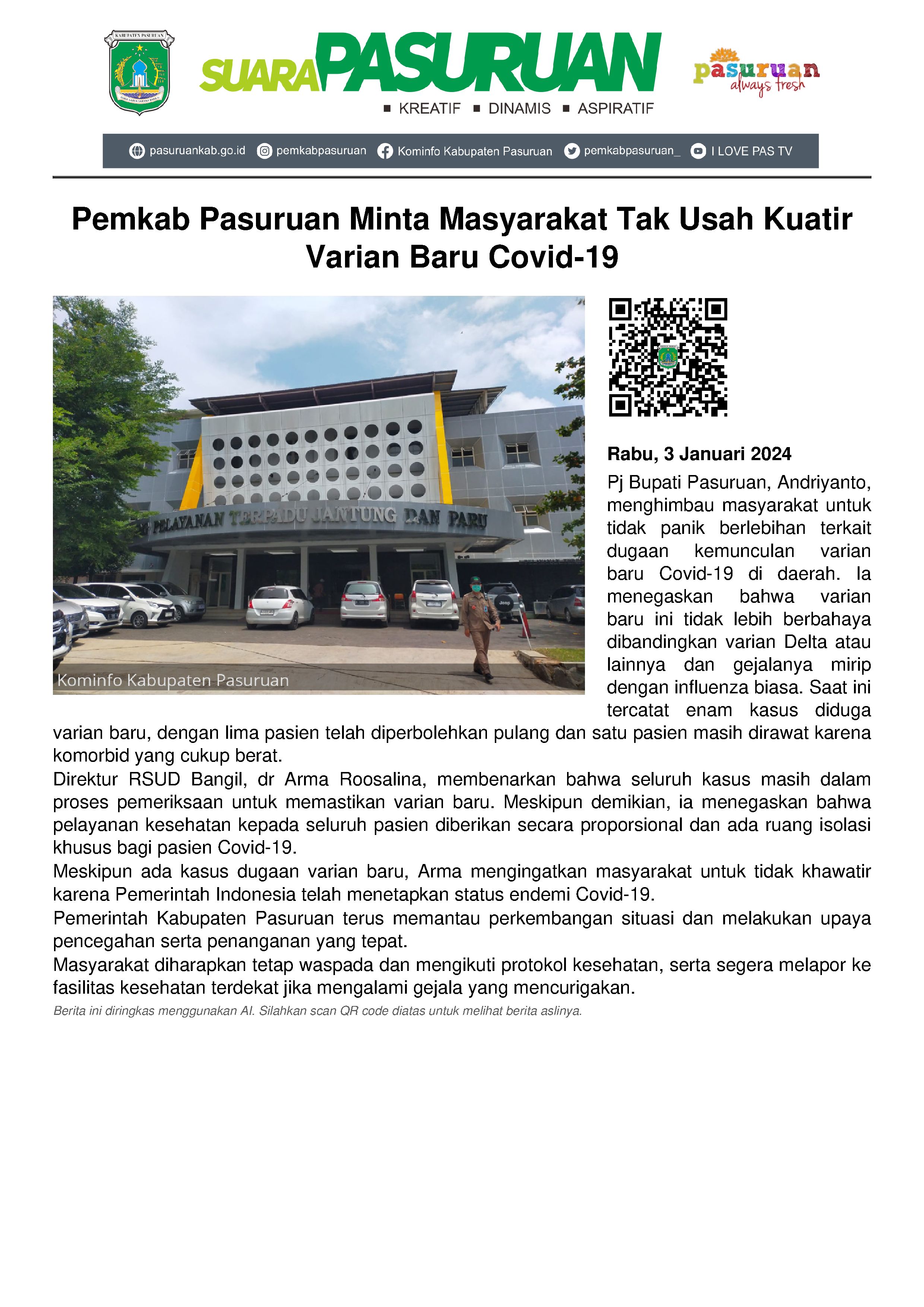 "Kami minta masyarakat tidak perlu panik berlebih menghadapi munculnya varian baru Covid-19. Karena varian yang ada saat ini, tidak lebih berbahaya dari sebelum-sebelumnya. Seperti varian Delta," kata Andriyanto di sela-sela kesibukannya, Rabu (03/01/2024).