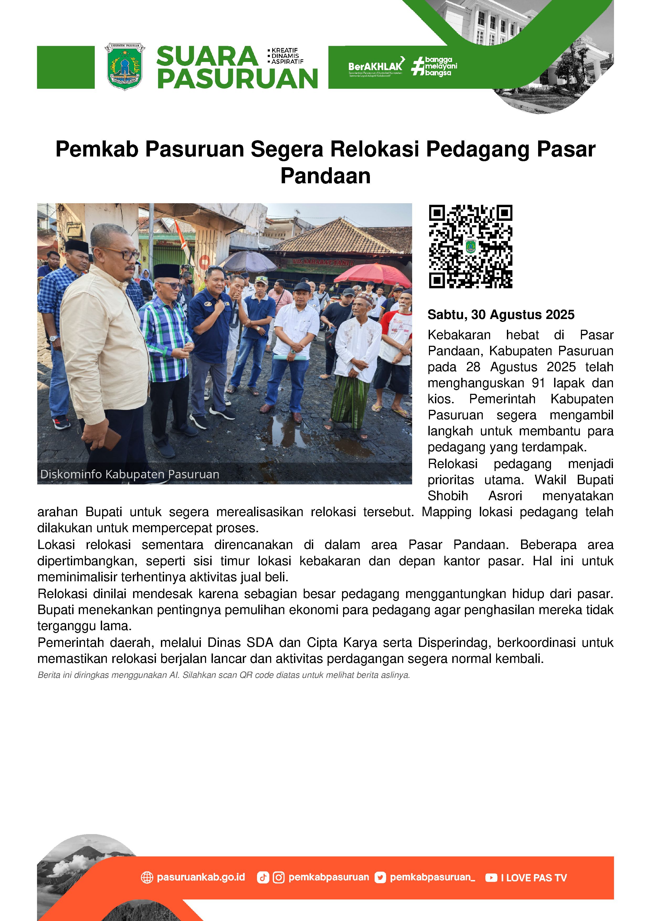 Pemerintah Kabupaten Pasuruan sudah menyiapkan banyak rencana pasca kebakaran yang melanda Pasar Pandaan, Kamis (28/8/2025).