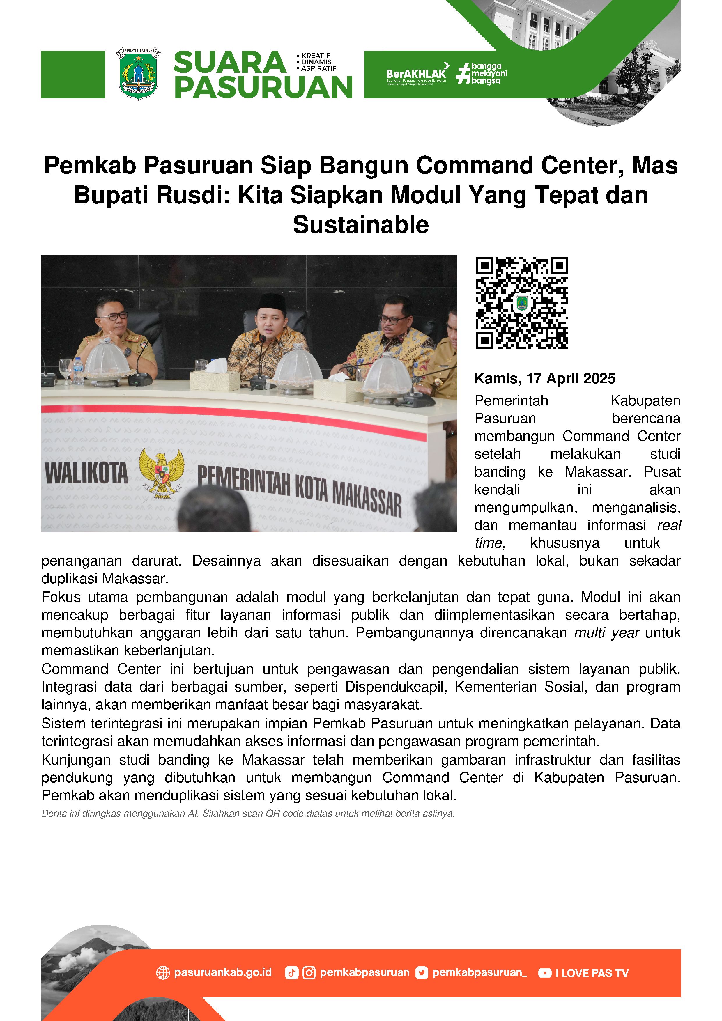 Diketahui, Selasa (15/4/2025), Mas Rusdi bersama Ketua DPRD Kabupaten Pasuruan Samsul Hidayat, Sekretaris Daerah Yudha Triwidya Sasongko, Asisten dan Kepala Perangkat Daerah terkait beranjangsana ke Command Center Pemerintah Kota Makassar. Kedatangannya di sana tidak lain untuk melihat lebih dekat sistem pusat komando semua layanan yang diakui Menteri Dalam Negeri (Mendagri) Tito Karnavian sebagai pionir Command Center di tanah air tersebut. Berikut, menginventarisir kelengkapan infrastruktur, server dan fasilitas pendukung apa saja yang dibutuhkan untuk selanjutnya diduplikasi sesuai kebutuhan. (Eka Maria)