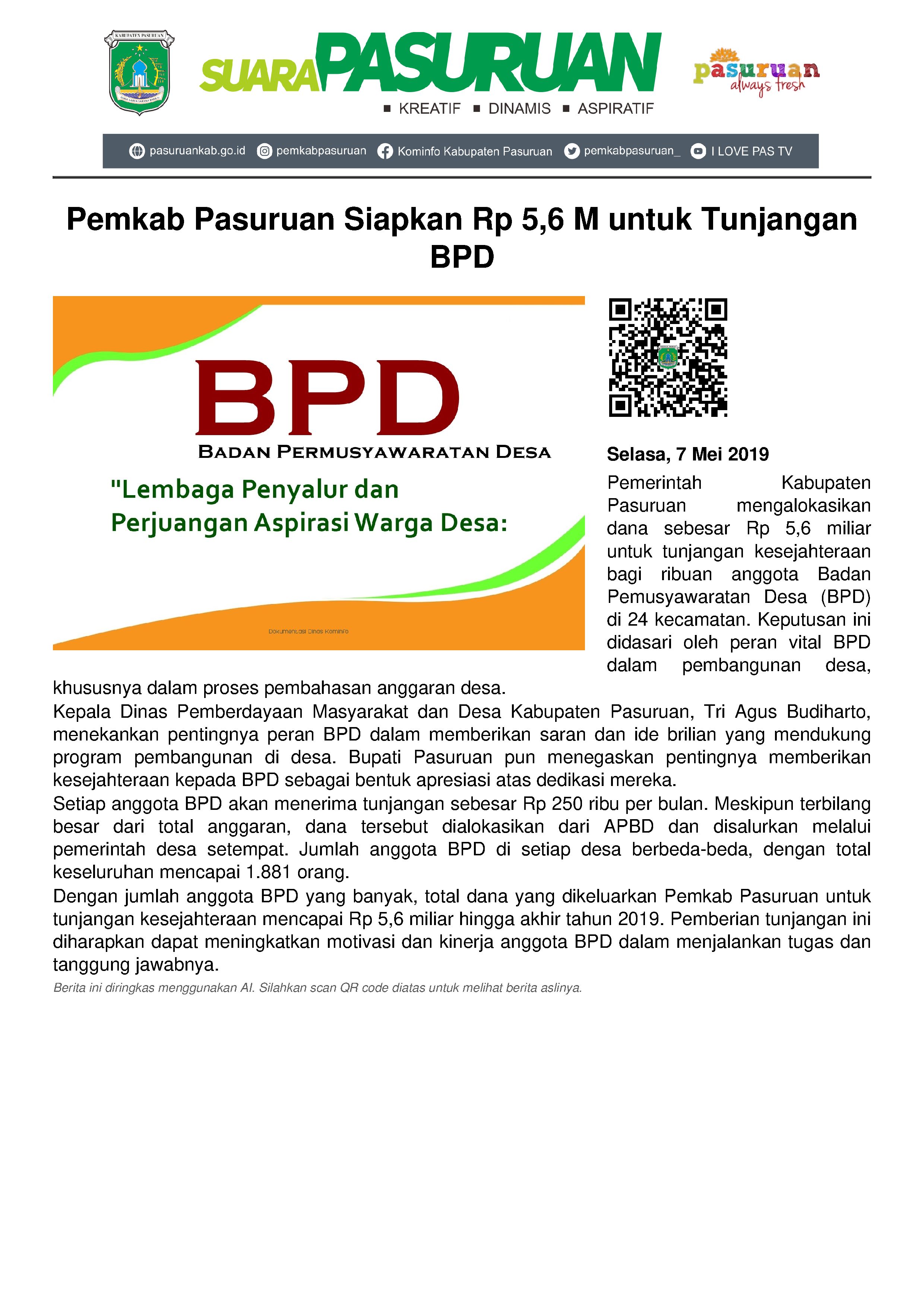 Peran BPD (Badan Pemusyawaratan Desa) yang begitu vital dalam setiap pembangunan di desa, membuat Pemerintah Kabupaten Pasuruan perlu memberikan tunjangan kesejahteraan.