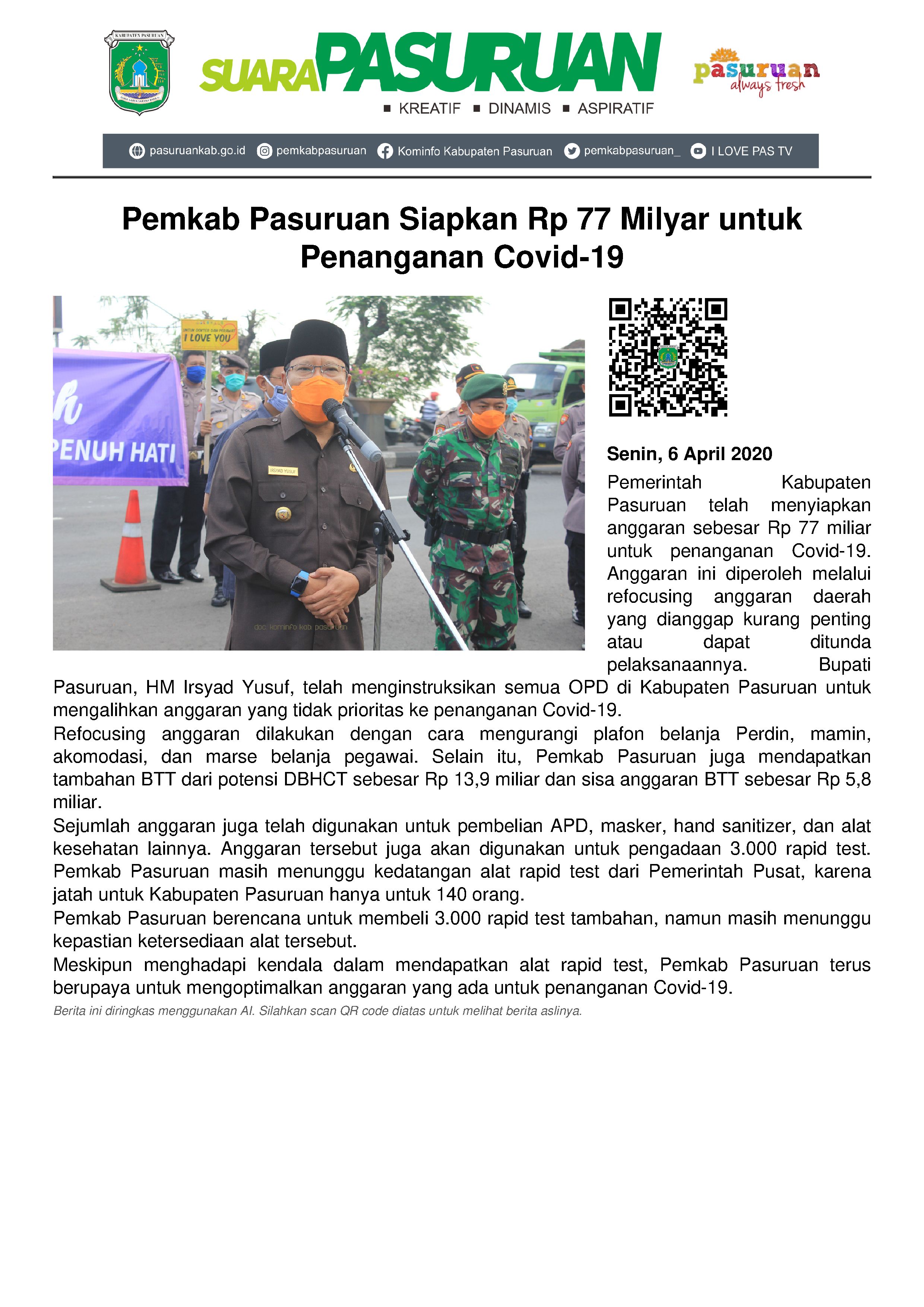 Pemerintah Kabupaten Pasuruan menyiapkan anggaran sebesar Rp 77 Milyar untuk penanganan Covid-19 di Kabupaten Pasuruan.