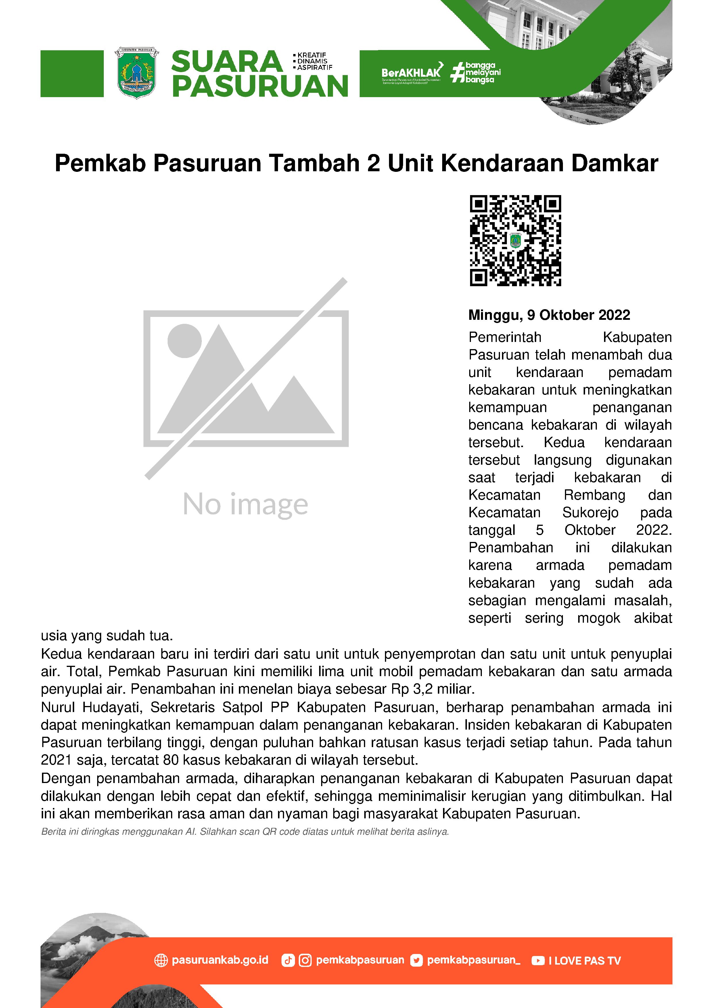 Dengan penambahan tersebut, setidaknya ada lima mobil pemadam kebakaran dan satu armada penyuplai air yang dimiliki Pemkab Pasuruan. Karena sebelumnya, sudah ada empat unit damkar.