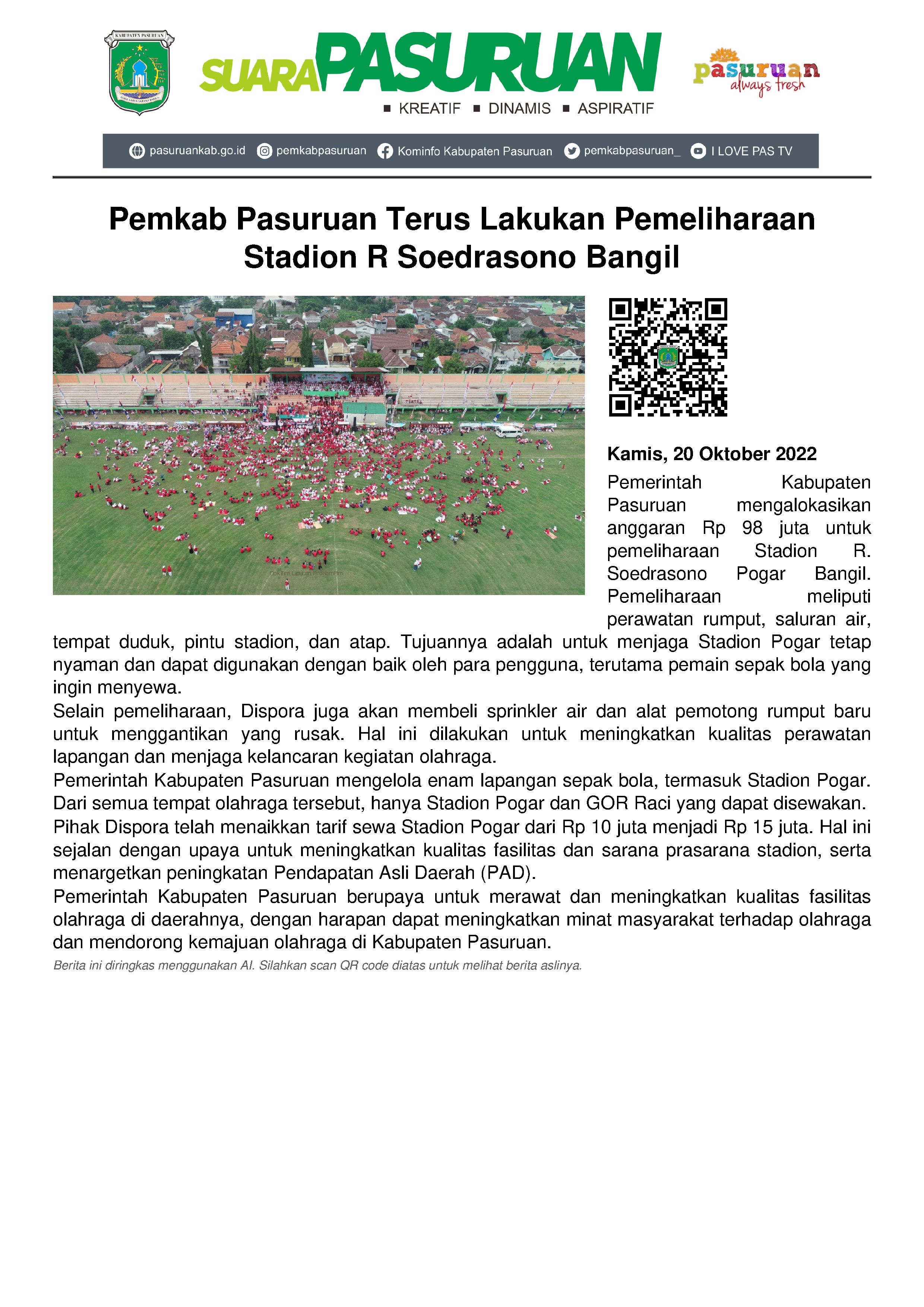 Kepala Dinas Pemuda dan Olahraga (Dispora) Kabupaten Pasuruan, Taufiqul Ghoni mengatakan, pemeliharaan stadion pogar meliputi pemeliharaan rumput, saluran air, tempat duduk, pintu stadion dan atap. Anggarannya diestimasikan sebesar Rp 98 juta yang telah diusulkan dalam PAK tahun ini.
