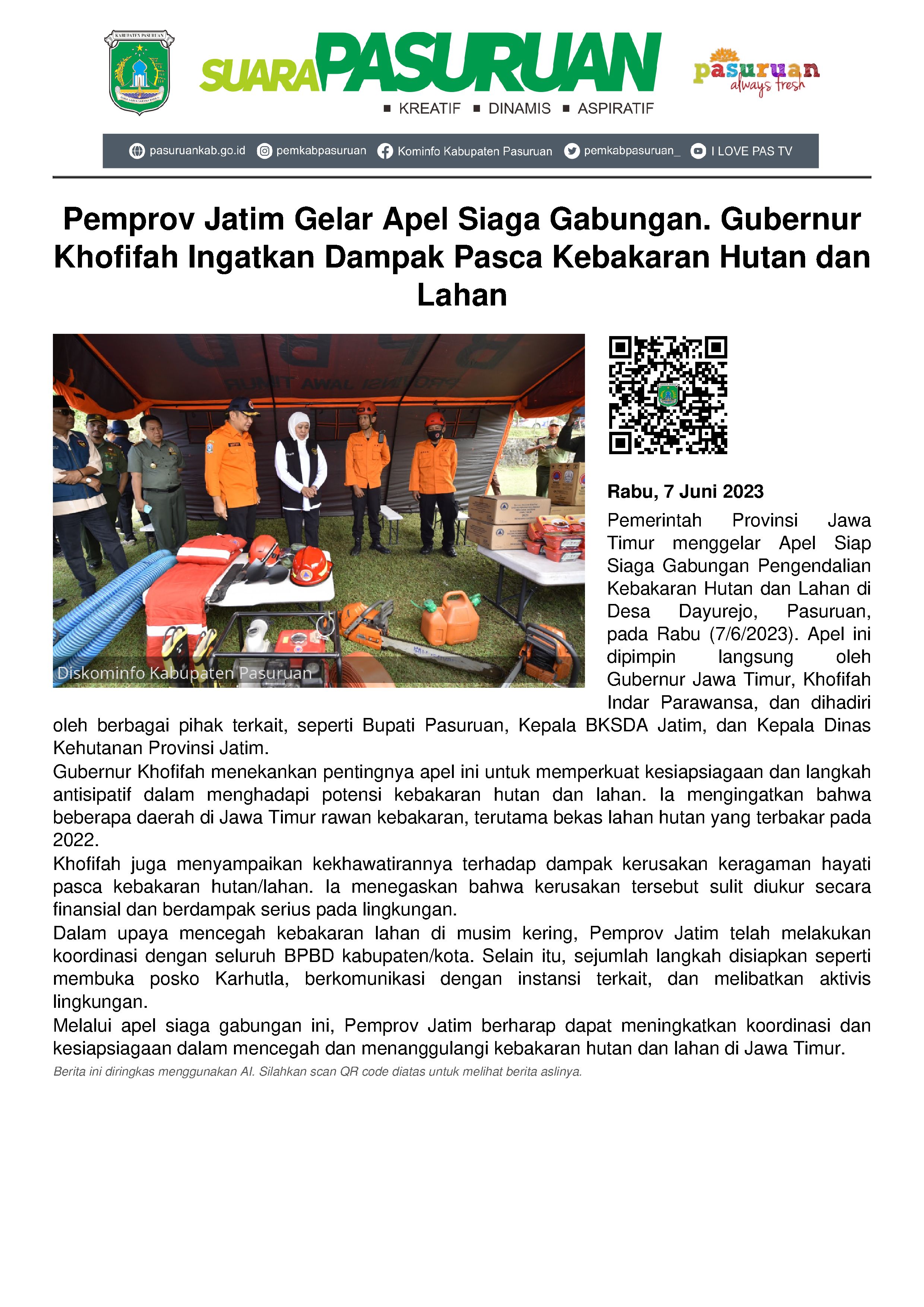 Pemerintah Provinsi Jawa Timur menggelar Apel Siap Siaga Gabungan Pengendalian Kebakaran Hutan dan Lahan di Jawa Timur, Rabu (07/06/2023) pagi.