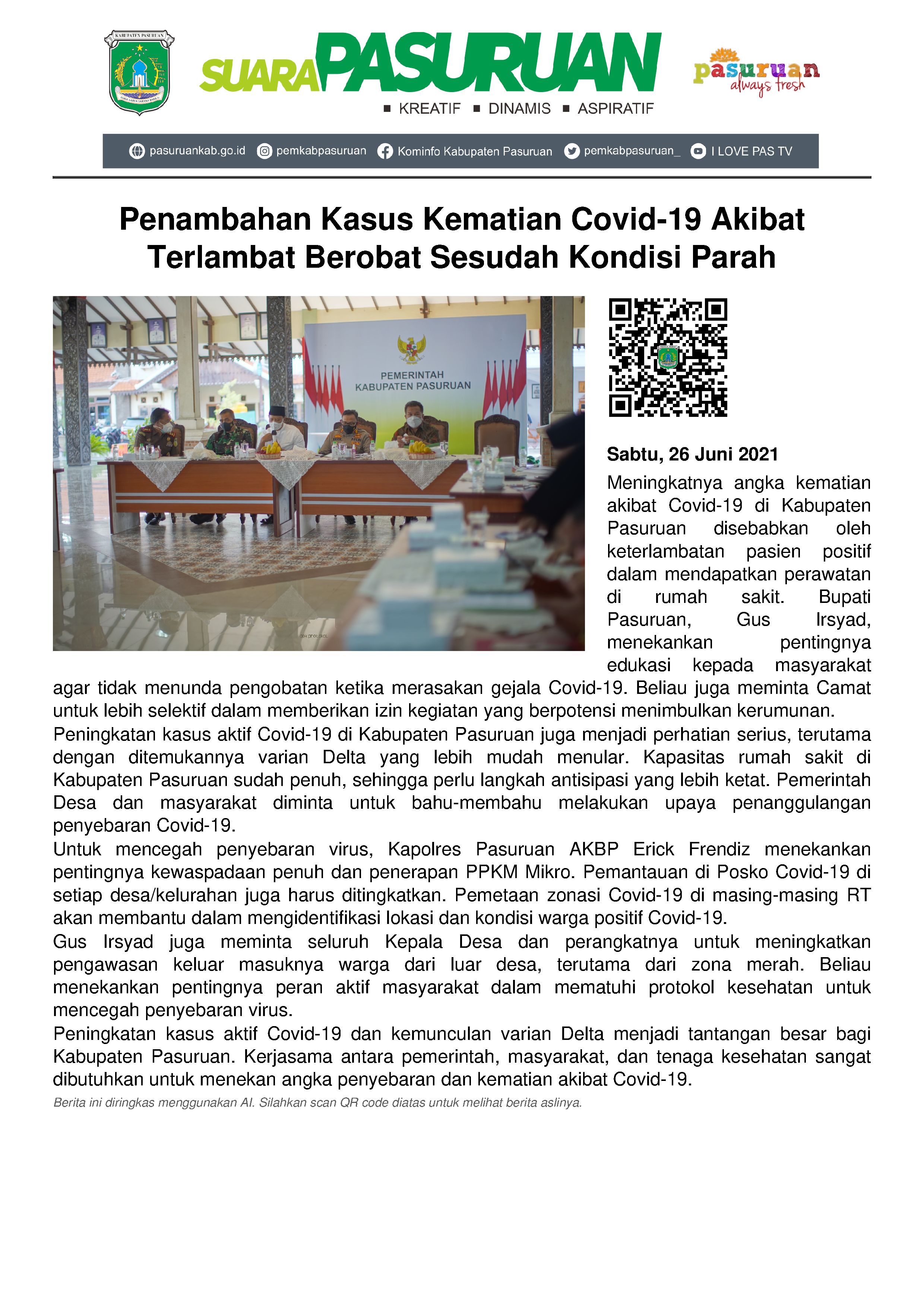Peningkatan kasus kematian Covid-19 disebabkan beberapa hal. Diantaranya dipicu karena keterlambatan berobat pasien terkonfirmasi positif ke RS rujukan Covid-19 sesudah kondisinya parah. Penjelasan itu disampaikan Gus Irsyad, sapaan familiar Bupati Pasuruan pada saat memimpin Rapat Koordinasi Penanganan Covid-19 di Kabupaten Pasuruan di Pendopo Nyawiji Ngesti Wenganing Gusti, Jumat sore (25/6/2021).
