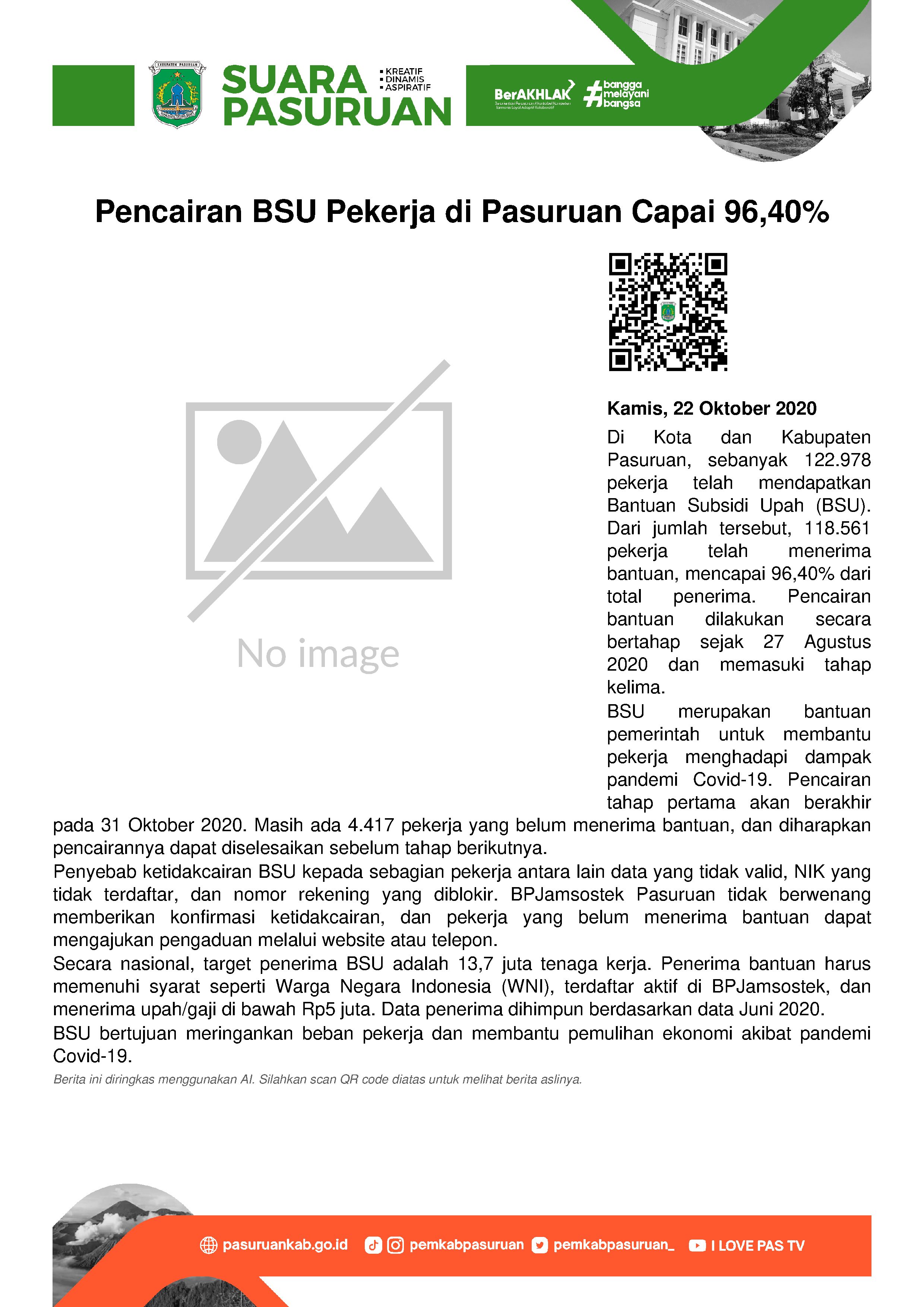 Kepala BPJS Ketenagakerjaan Cabang Pasuruan, Arie Fianto mengatakan, ratusan ribu pekerja tersebut sudah menyerahkan dan melakukan update data rekening, dan secara bertahap telah dilakukan pencairan bantuan oleh pemerintah sejak 27 agustus 2020.