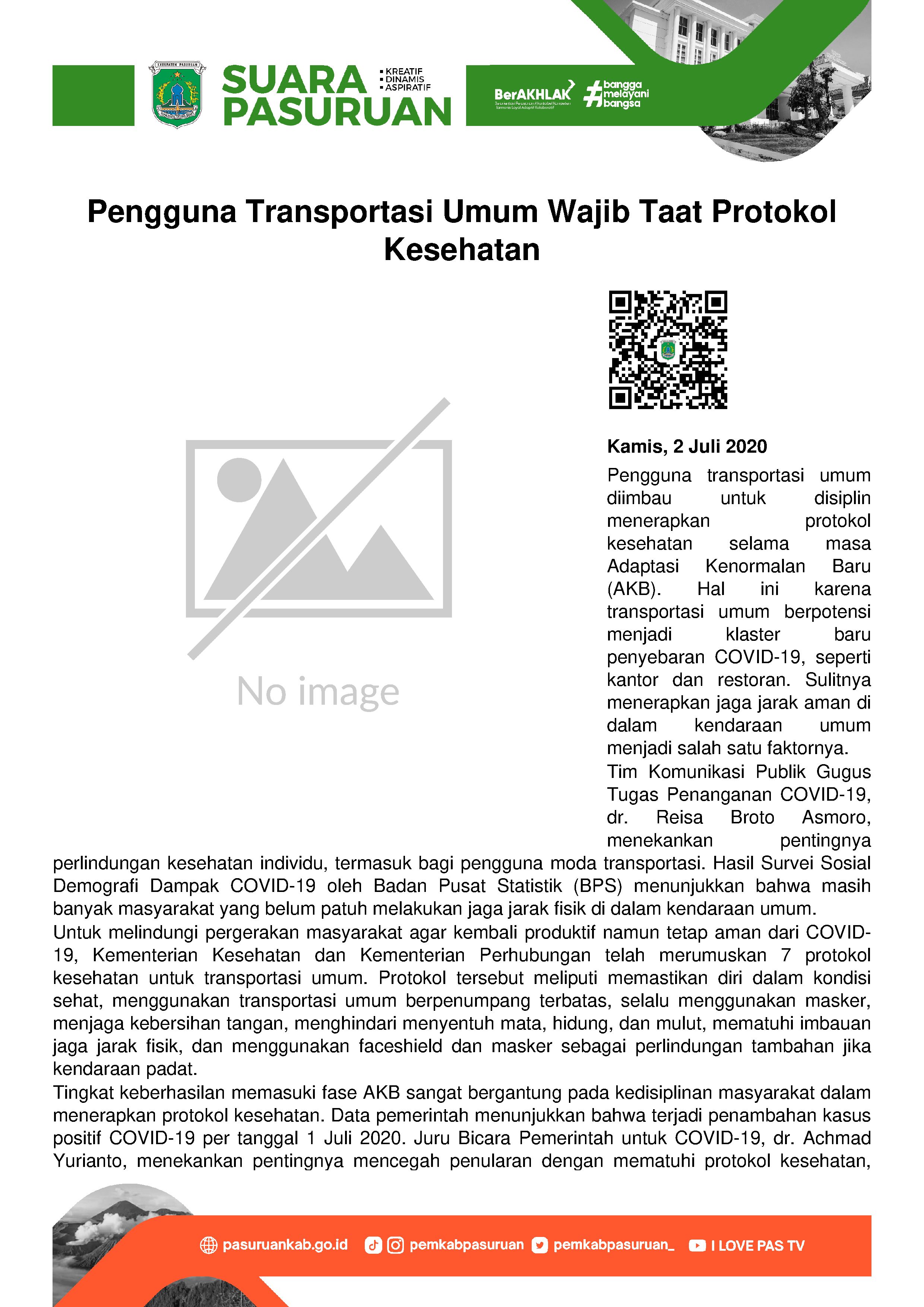 Masyarakat pengguna transportasi umum wajib disiplin menerapkan protokol kesehatan selama masa Adaptasi Kenormalan Baru (AKB). Hal tersebut karena moda transportasi umum menjadi satu dari tiga ruang publik yang berpotensi sebagai klaster baru penyebaran Covid-19, selain kantor dan restoran. Juga sulitnya menerapkan jaga jarak aman selama didalam kendaraan umum. Himbauan ini disampaikan Tim Komunikasi Publik Gugus Tugas Penanganan COVID-19, dr Reisa Broto Asmoro. mengingatkan masyarakat pengguna transportasi umum untuk terus disiplin menerapkan protokol kesehatan.