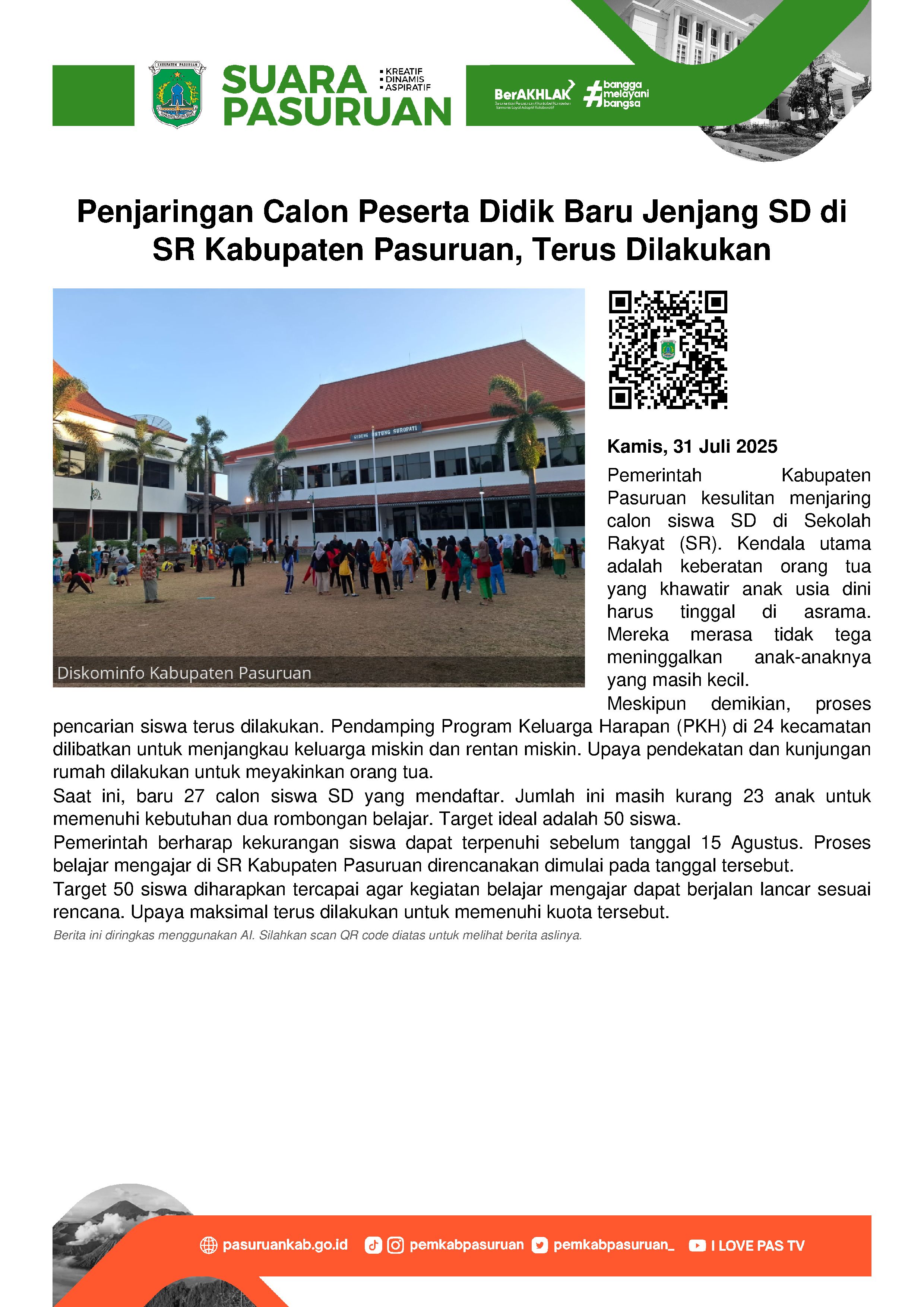 Pemerintah Kabupaten Pasuruan tengah menghadapi kendala dalam menjaring calon peserta didik untuk jenjang Sekolah Dasar (SD) di Sekolah Rakyat.