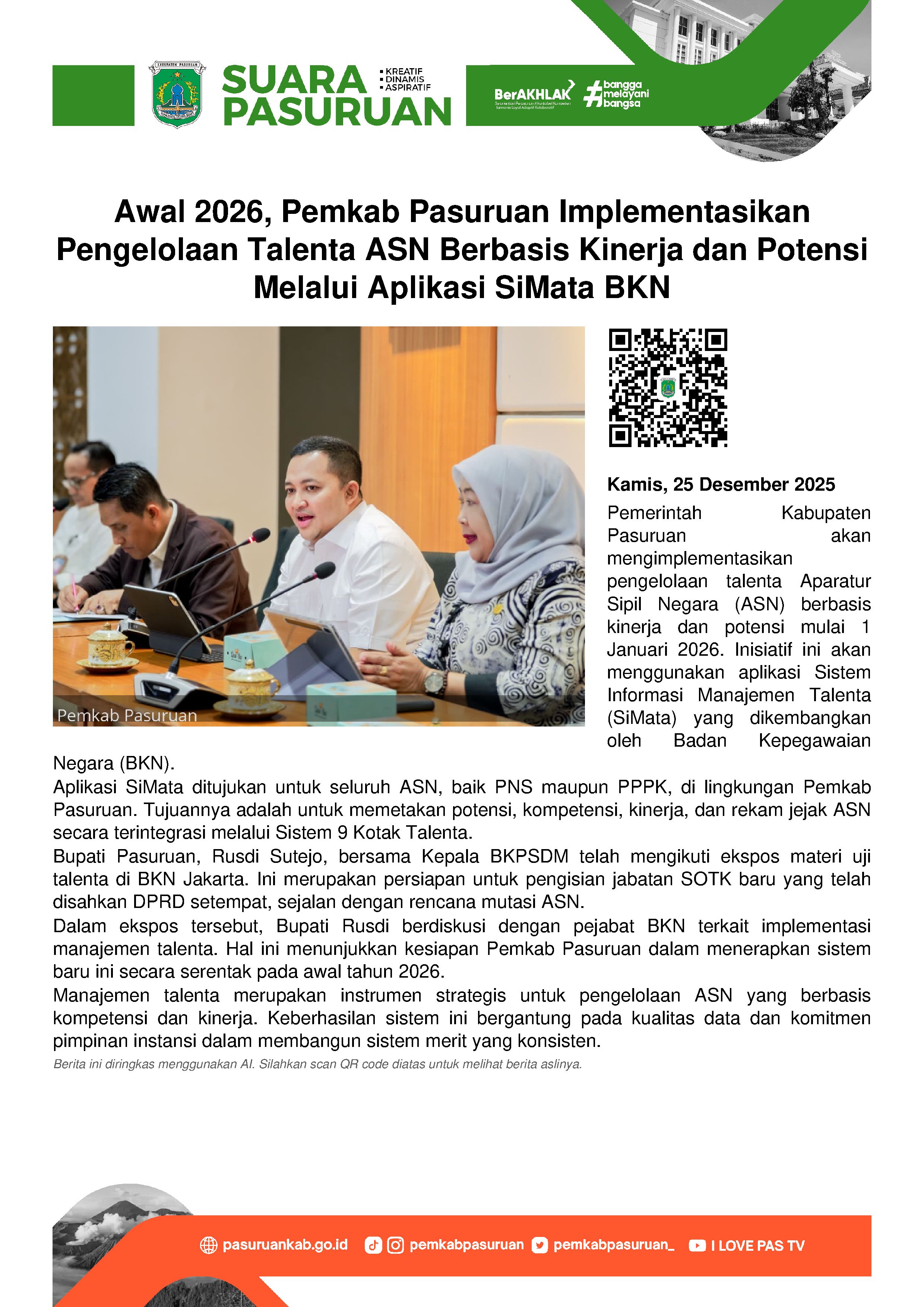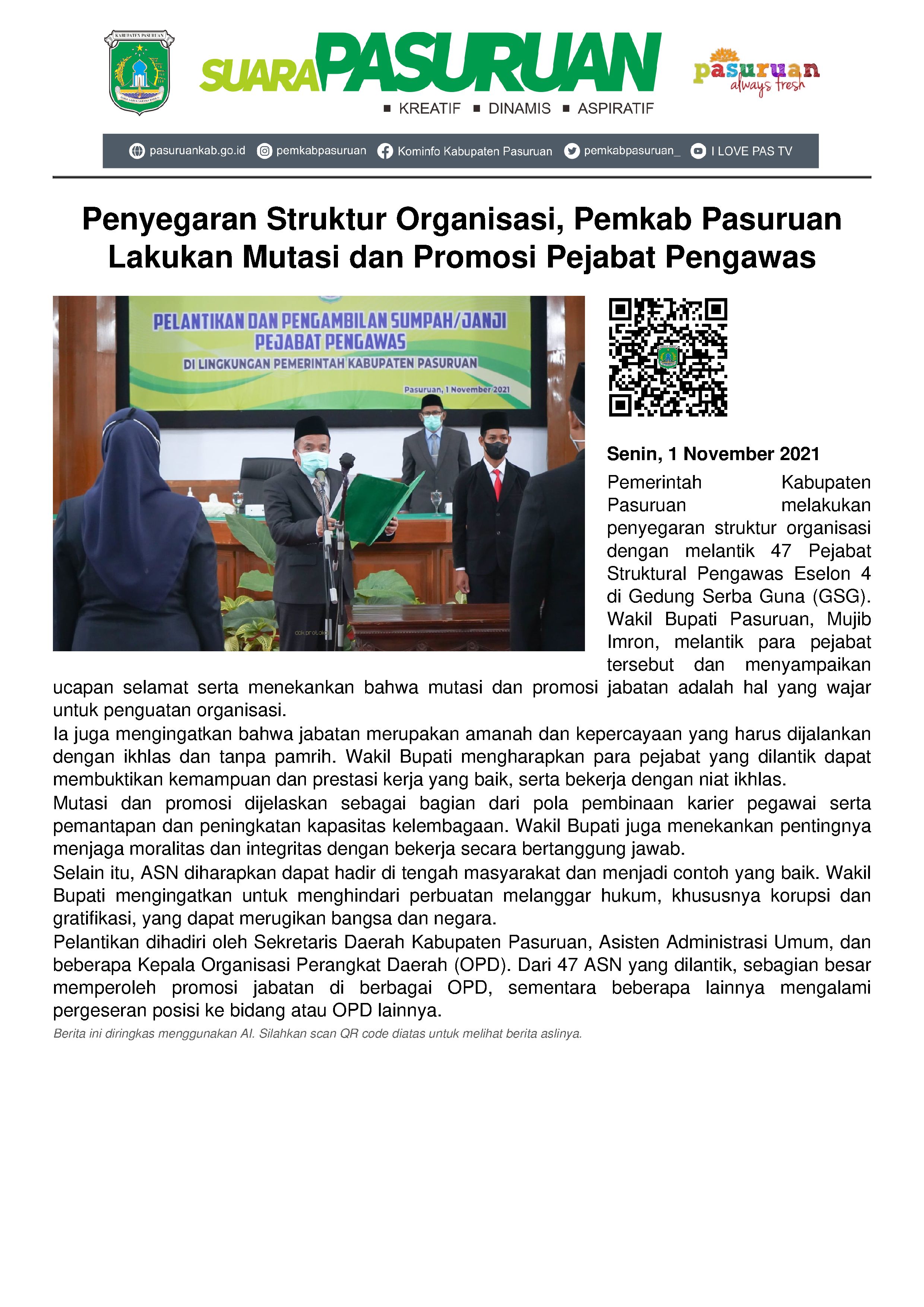 Mengawali hari di bulan November 2021, Pemerintah Kabupaten Pasuruan melakukan penyegaran struktur organisasi di lingkungan Pemerintah Kabupaten Pasuruan. Bertempat di Gedung Serba Guna (GSG), Wakil Bupati Pasuruan Mujib Imron melantik 47 Pejabat Struktural Pengawas Eselon 4.