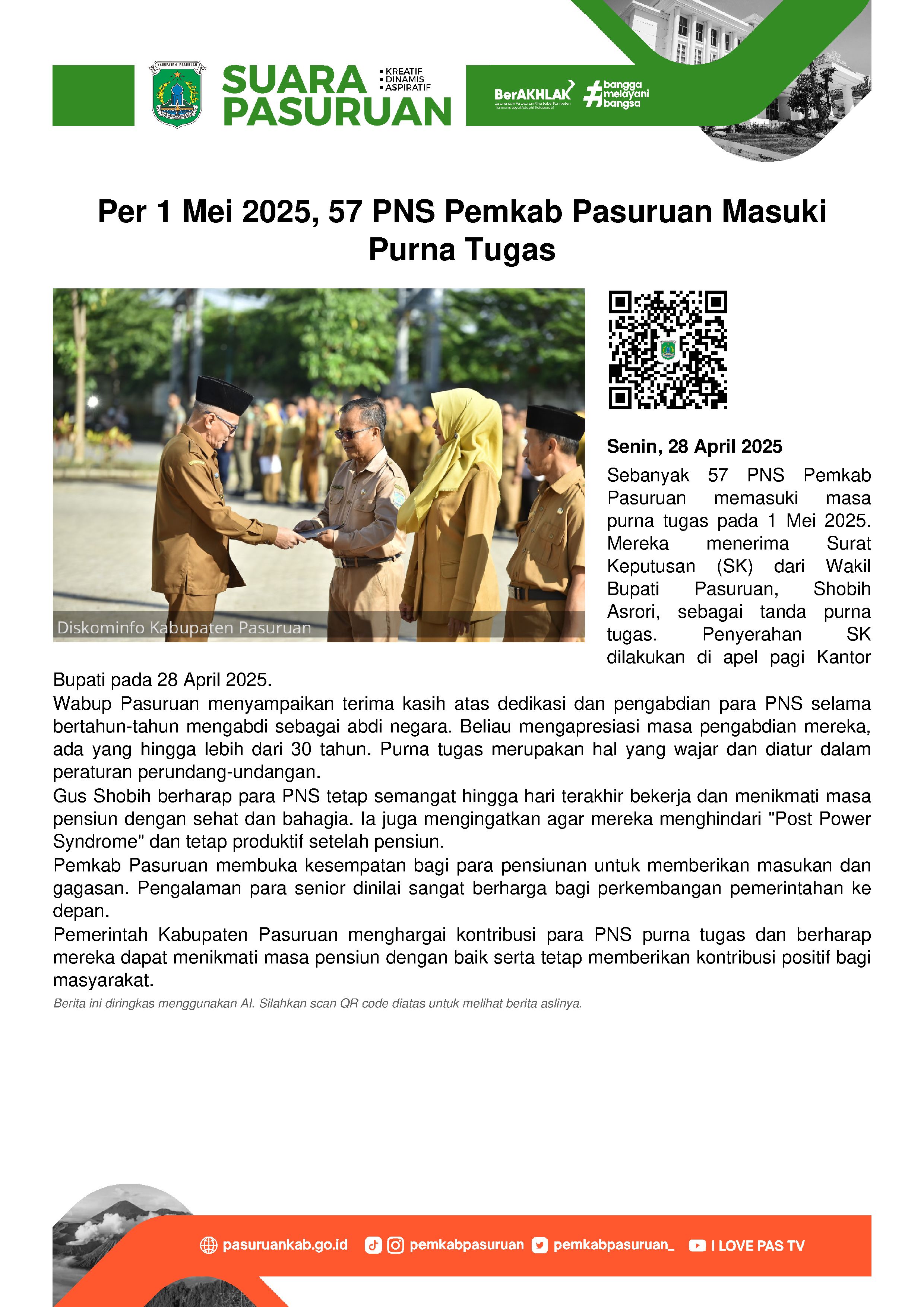 Per 1 Mei 2025, sebanyak 57 Pegawai Negeri Sipil (PNS) di Lingkungan Pemerintah Kabupaten Pasuruan memasuki masa purna tugas.