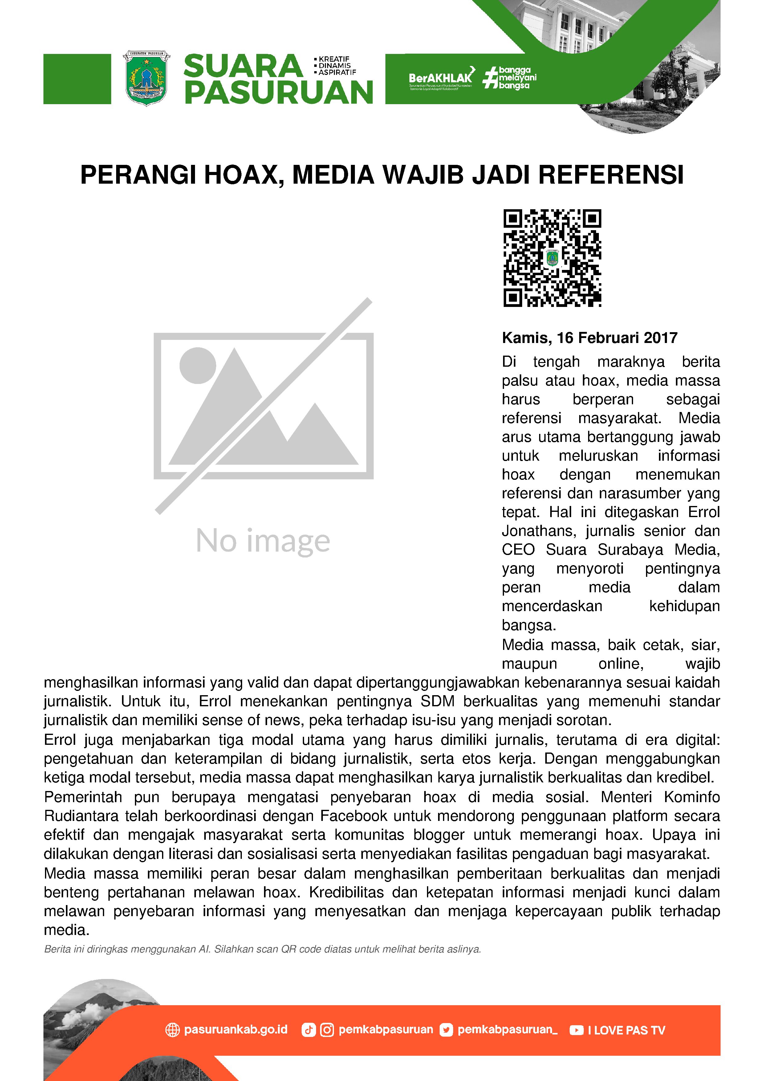 Di tengah ramainya pemberitaan palsu atau hoax yang saat ini menjadi keprihatinan pemerintah pusat, media massa harus bisa menjadi referensi masyarakat. Artinya, media massa terutama media mainstream/ media arus utama mampu meluruskan informasi yang sifatnya hoax dengan menemukan referensi yang tepat melalui narasumber. Pernyataan ini disampaikan Errol Jonathans jurnalis senior sekaligus CEO Suara Surabaya Media, menyikapi maraknya berita hoax di masyarakat.