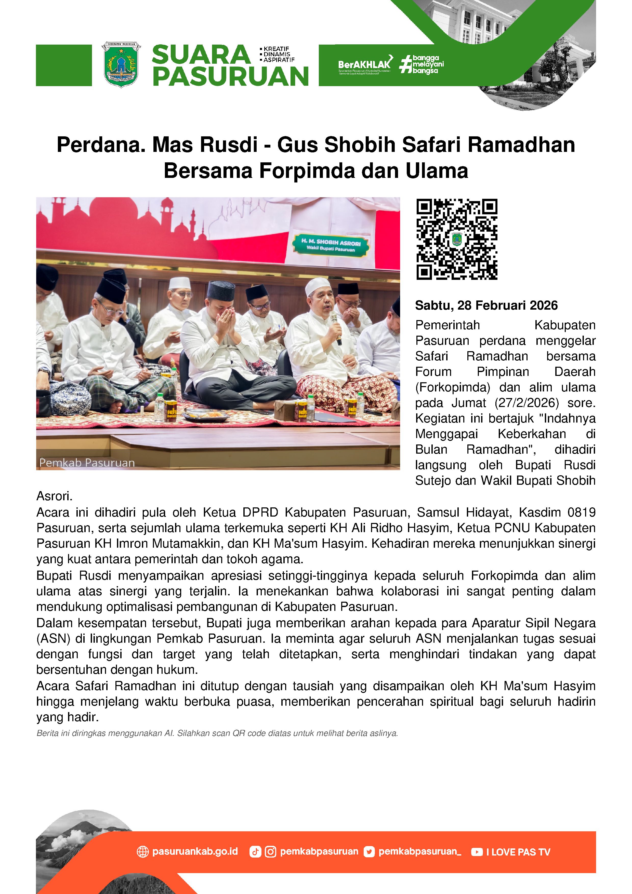 Perdana, Pemerintah Kabupaten Pasuruan menggelar Safari Ramadhan bersama Forkopimda dan alim ulama, Jumat (27/2/2026) sore.