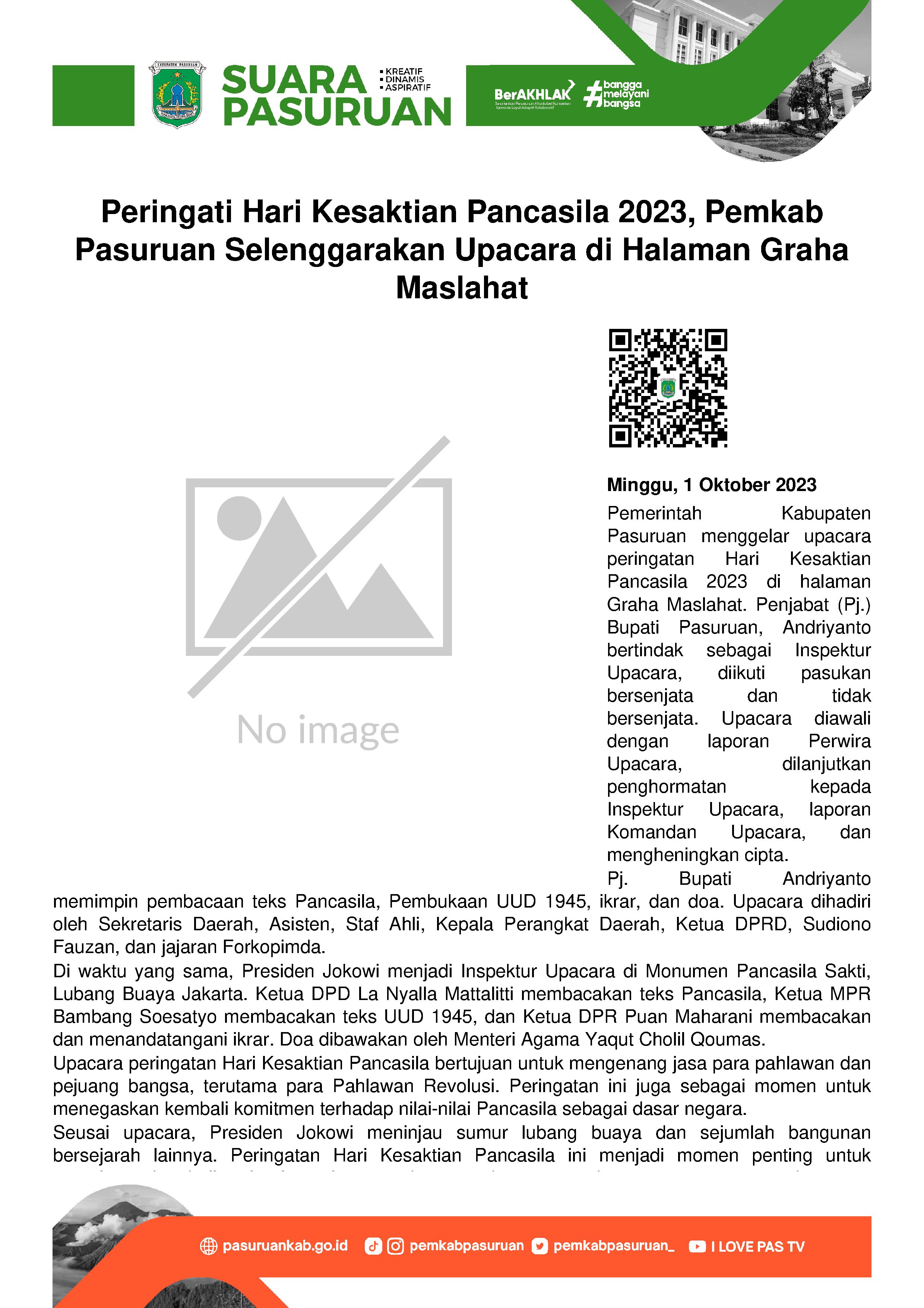 Memperingati Hari Kesaktian Pancasila Tahun 2023, hari ini Minggu (1/10/2023), Pemerintah Kabupaten Pasuruan menggelar upacara di halaman Graha Maslahat, Komplek Perkantoran Kabupaten Pasuruan. Bertindak sebagai Inspektur Upacara, Penjabat (Pj.) Bupati Pasuruan, Andriyanto yang diikuti oleh pasukan bersenjata dan pasukan tidak bersenjata.