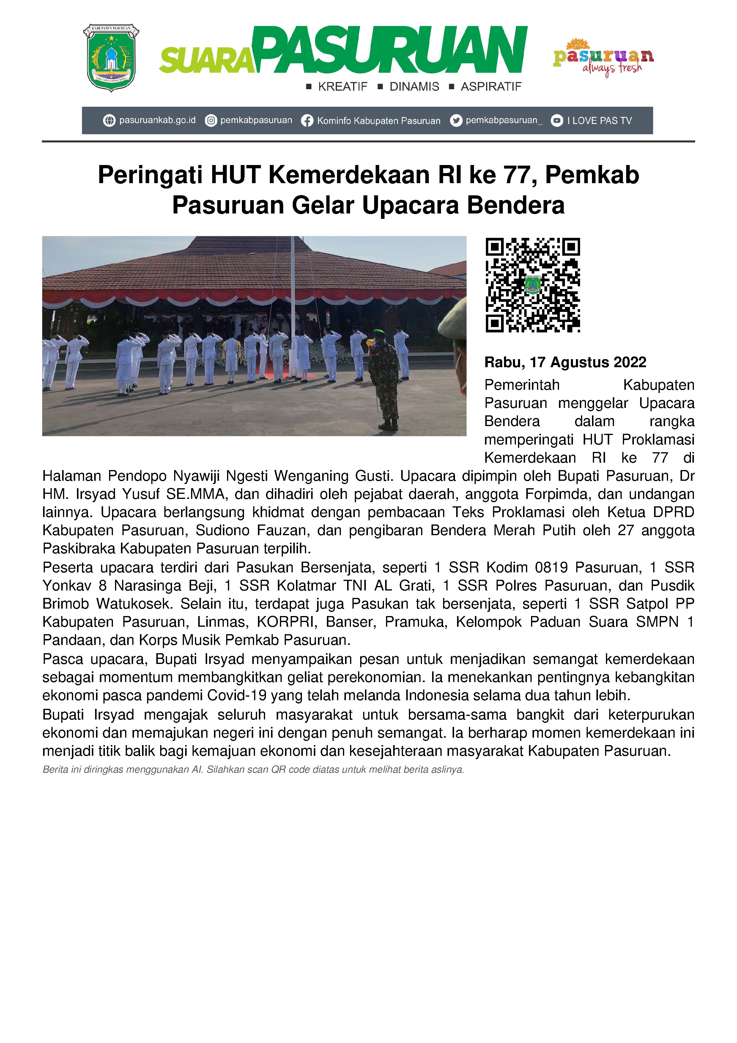 Dalam rangka memperingati HUT Proklamasi Kemerdekaan RI ke 77, Pemerintah Kabupaten Pasuruan menggelar Upacara Bendera.