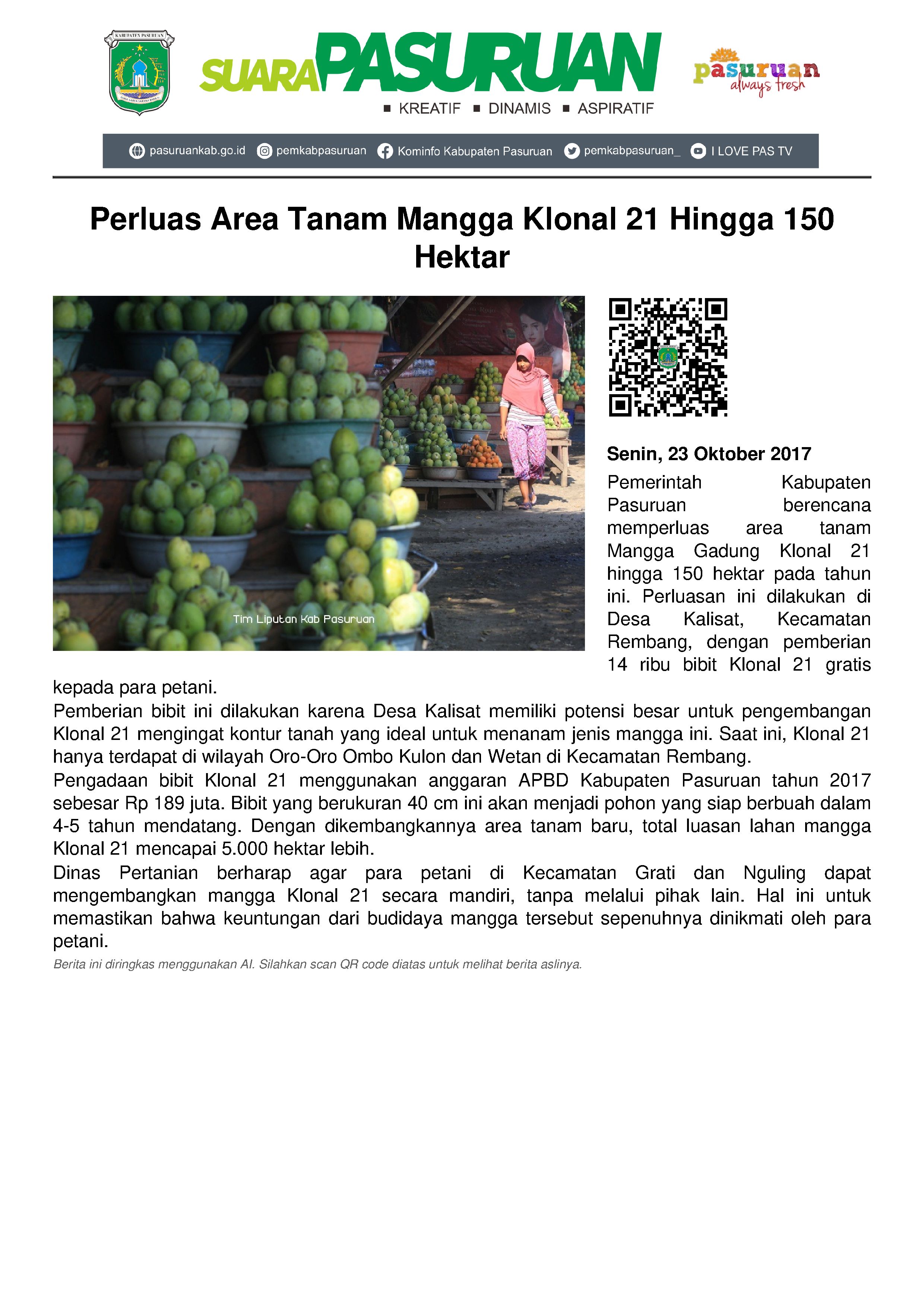 Ihwan, Kepala Dinas Pertanian Kabupaten Pasuruan mengatakan, perluasan area tanam baru diwujudkan dalam pemberian bibit klonal, lantaran di Desa Kalisat masih belum ditanami Mangga Klonal 21 oleh masyarakat setempat. Padahal, potensi untuk mengembangkan Klonal 21 di desa tersebut sangat bagus, lantaran memiliki kontur tanah yang ideal untuk ditanami ikon buah kebanggaan Kabupaten Pasuruan itu.