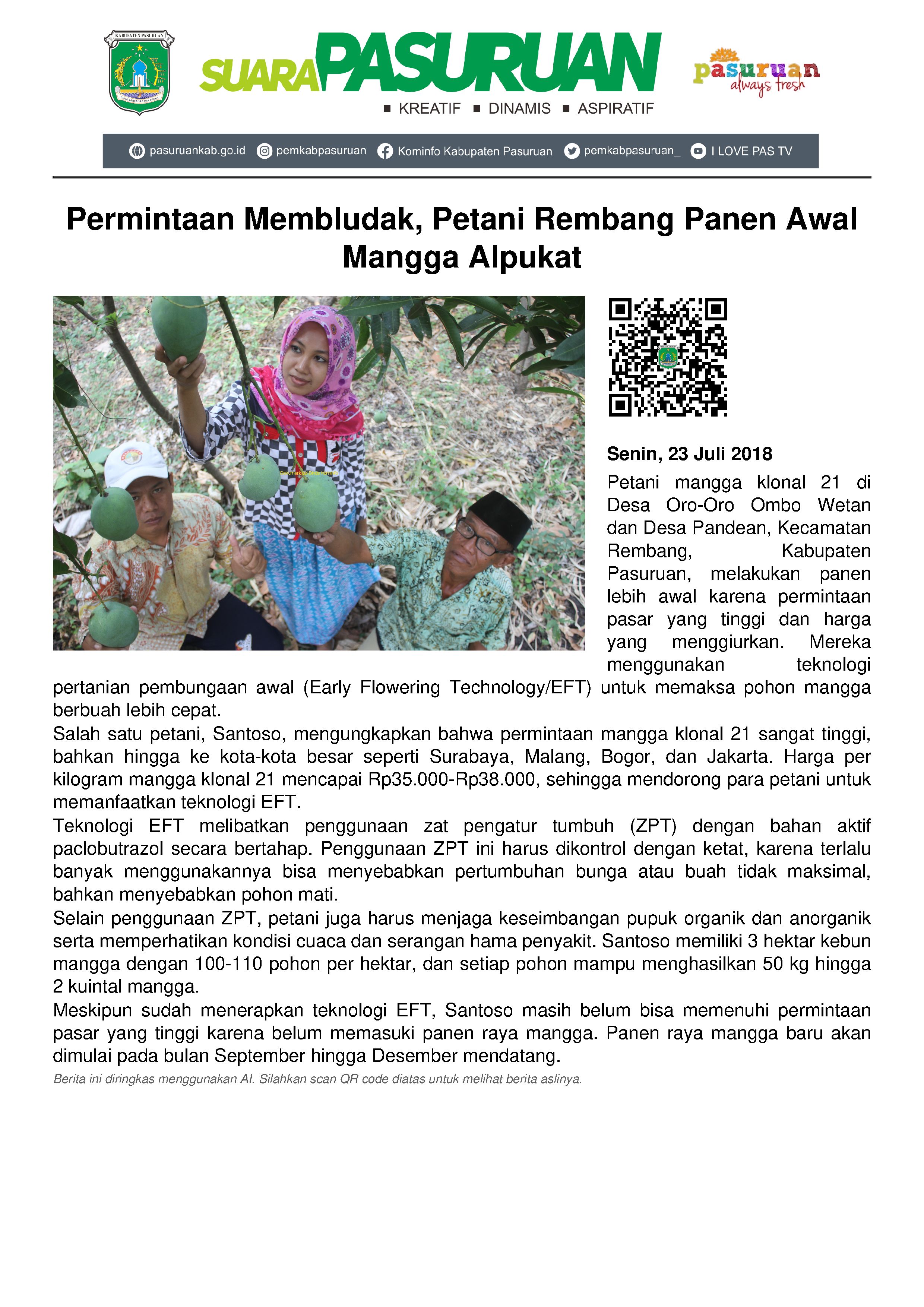 "Banyak pelanggan yang sudah memesan, mulai dari pengepul sampai pemborong dari Surabaya, Malang, Bogor dan Jakarta yang mau membeli mangga klonal 21 dengan harga Rp 38 ribu per 1 kg, makanya mau gak mau saya harus bisa membuat pohon-pohon mangga saya untuk segera berbuah," ungkap Santoso saat ditemui di kebun mangga miliknya, Senin (23/07/2018)
