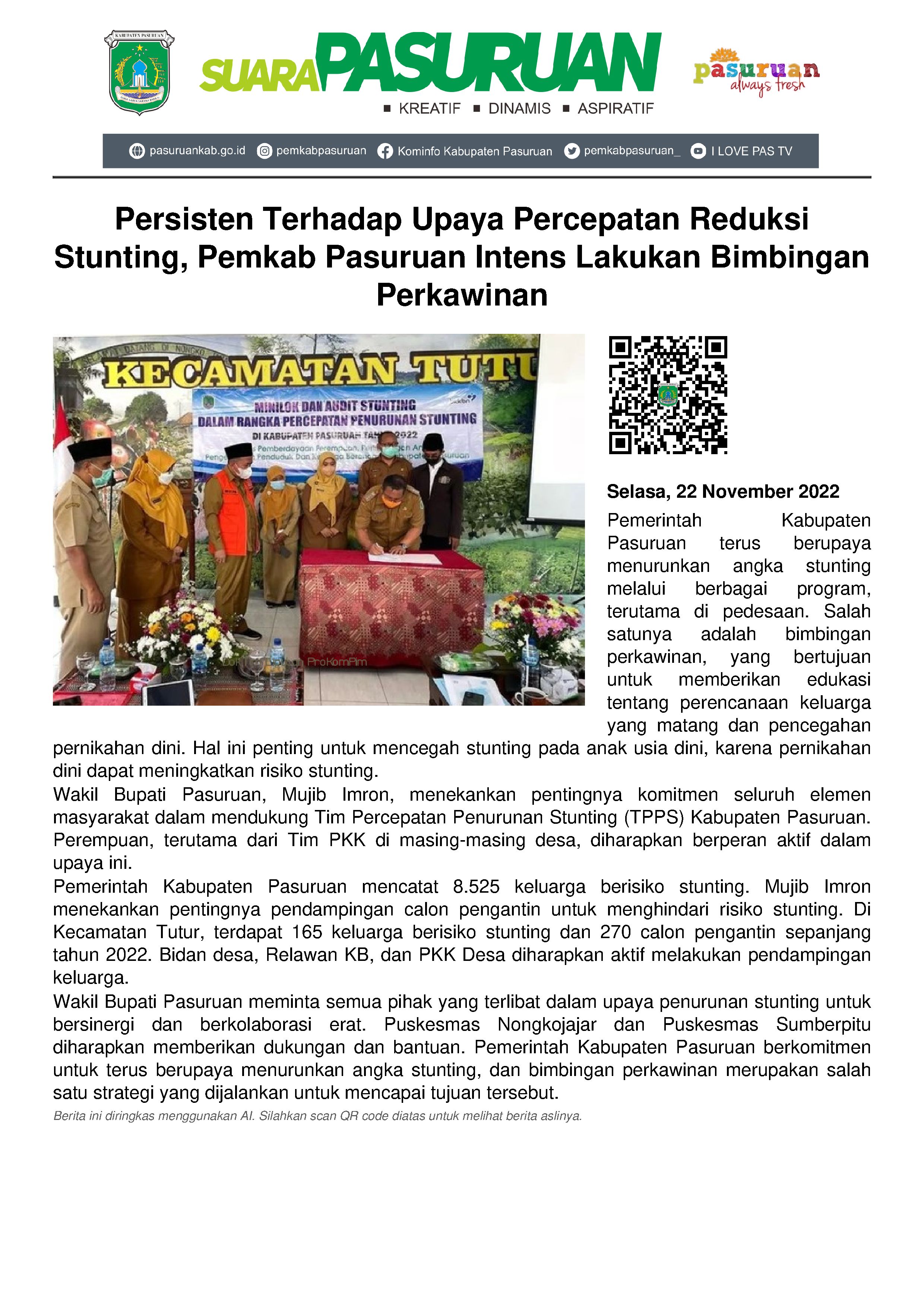 "Keluarga beresiko stunting di Kabupaten Pasuruan ada 8.525. Ini kalau tidak ditangani cepat bisa menghambat pertumbuhan anak dan IQ tidak dapat diandalkan. Dari jumlah semuanya harus kita petakan. Dengan pendampingan kepada calon pengantin, resiko stunting bisa dihindari,” tandasnya.