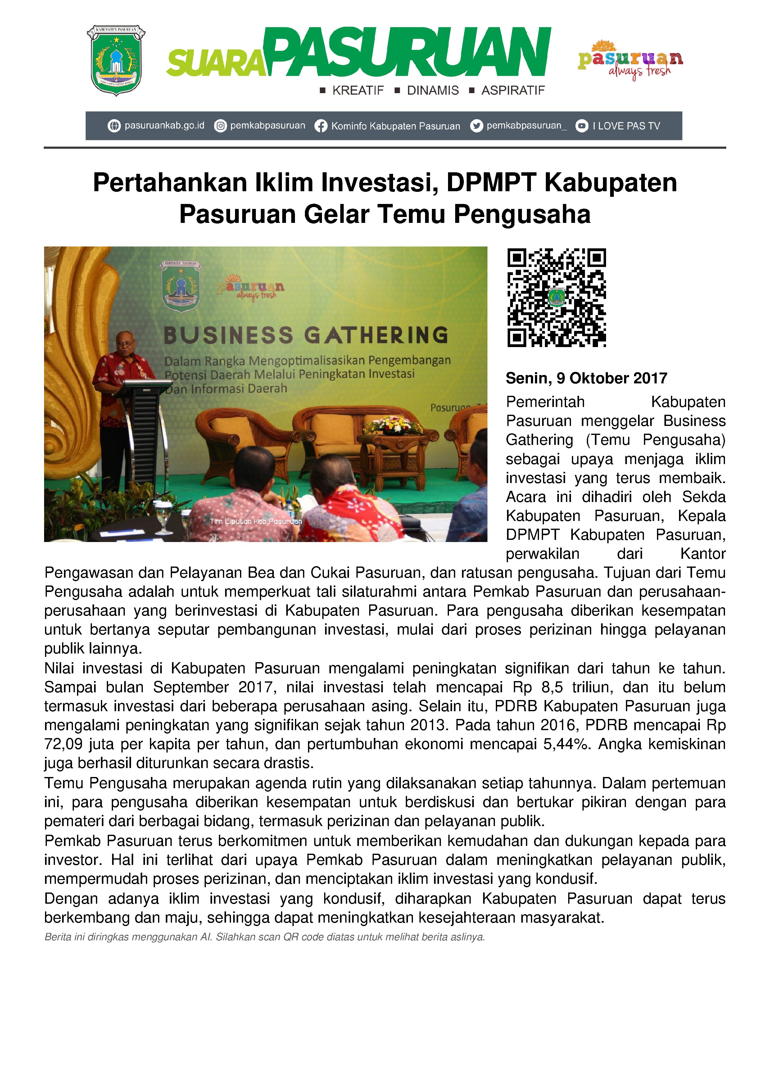Sebagai bagian dari upaya menjaga iklim investasi di Kabupaten Pasuruan yang terus membaik, Pemerintah Kabupaten Pasuruan melalui Dinas Penanaman Modal dan Pelayanan Terpadu kembali menggelar Business Gathering (Temu Pengusaha), di Finna Golf and Country Club Resort, Prigen, Selasa (03/10/2017).