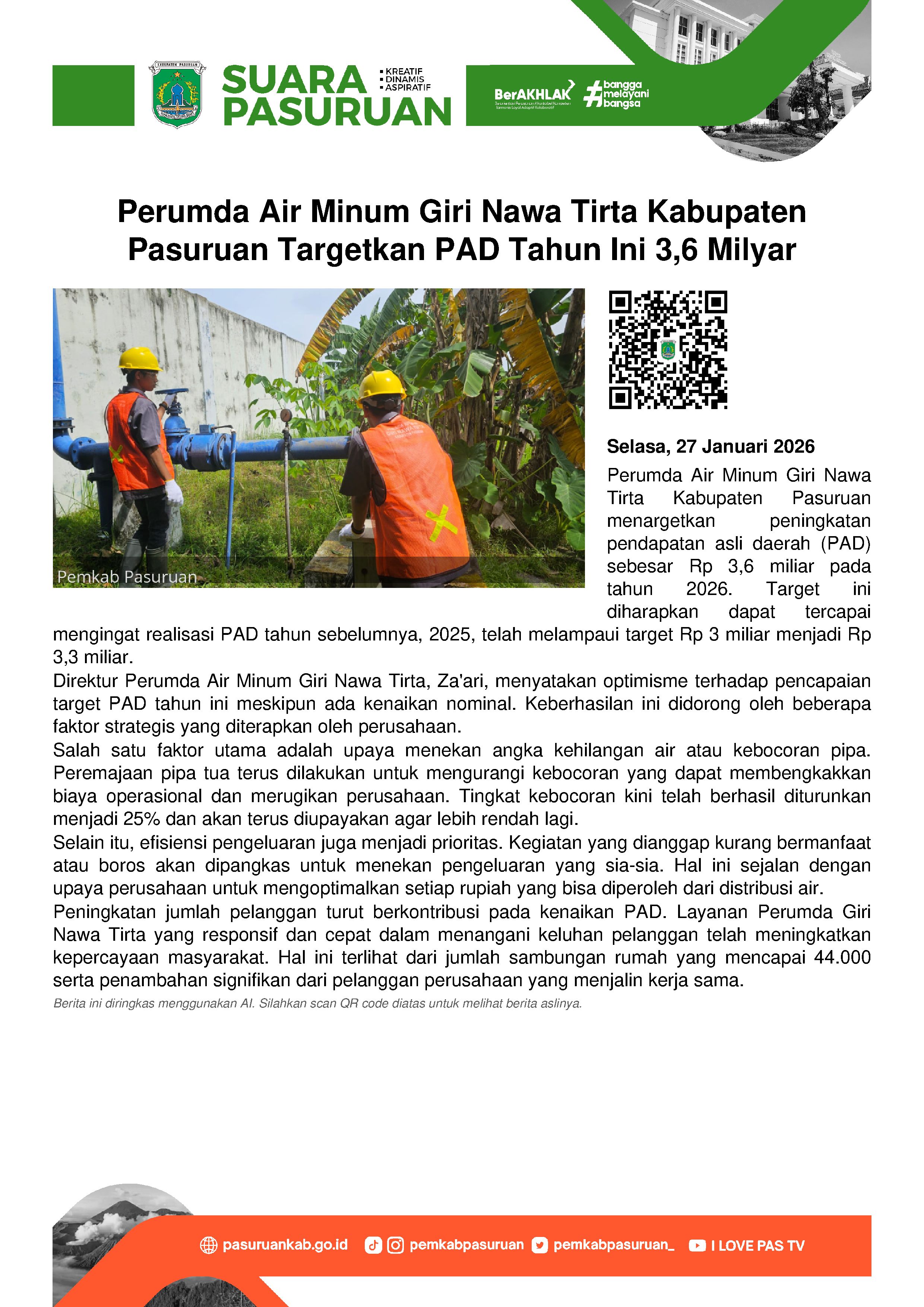 Perumda Air Minum Giri Nawa Tirta Kabupaten Pasuruan menargetkan kenaikan pendapatan asli daerah (PAD) tahun 2026 mencapai Rp 3,6 Milyar.