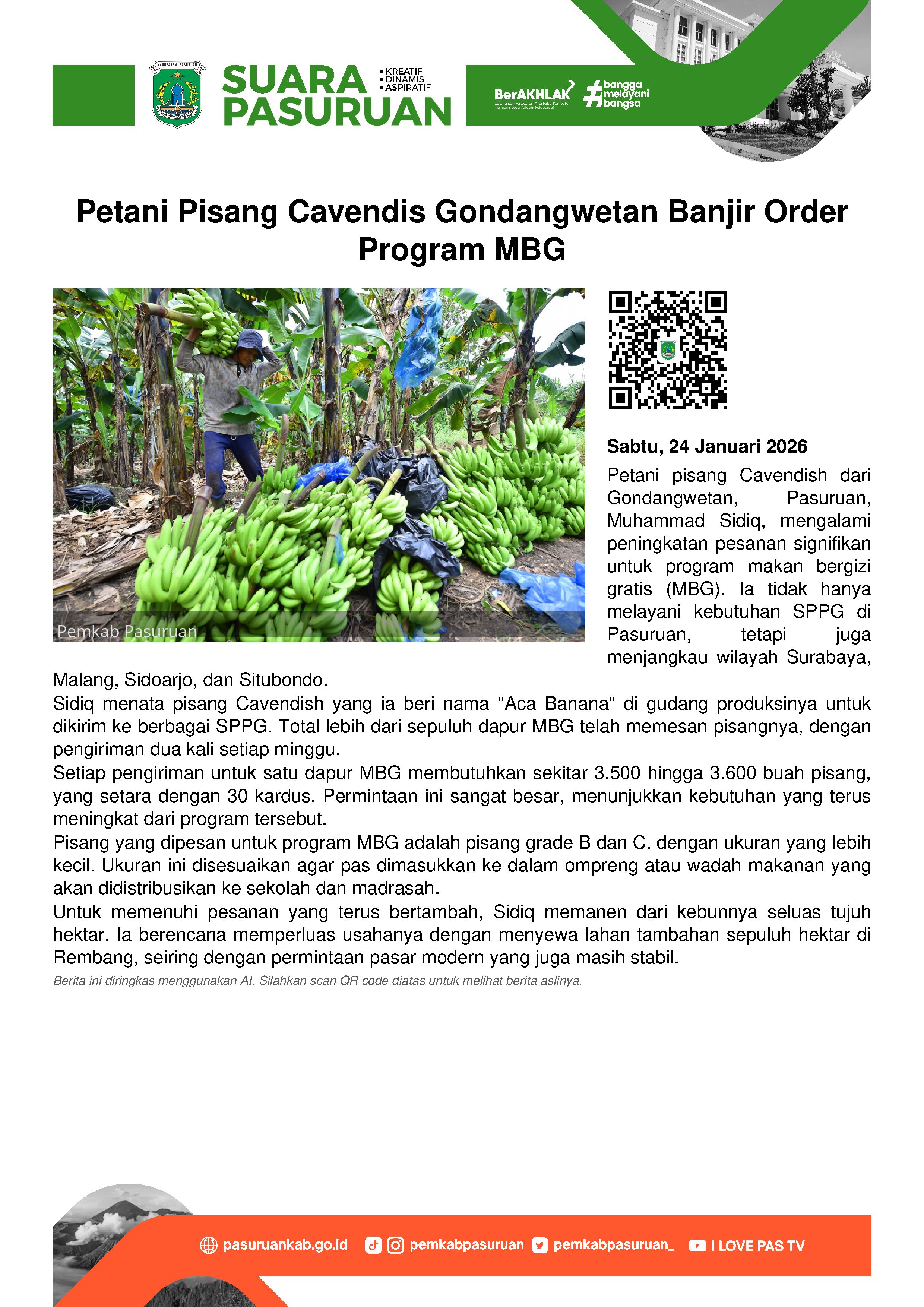 Pengusaha pisang cavendis dari Desa Kalirejo, Kecamatan Gondangwetan, Kabupaten Pasuruan, Muhammad Sidiq kebanjiran order untuk kebutuhan program makan bergizi gratis (MBG) di sejumlah SPPG (Satuan Pelayanan Pemenuhan Gizi).