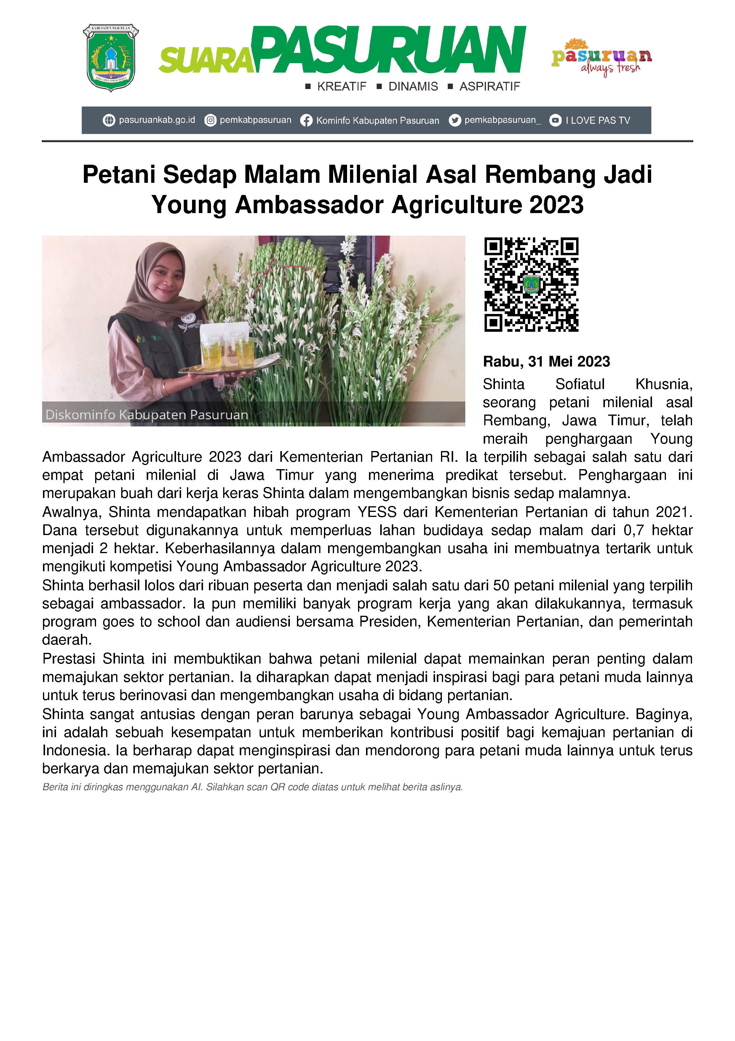 Siapa sangka, ada petani milenial asal Ketapan, Desa Pekoren, Kecamatan Rembang, Kabupaten Pasuruan sukses meraih penghargaan Young Ambassador Agriculture 2023 dari Kementrian Pertanian RI.