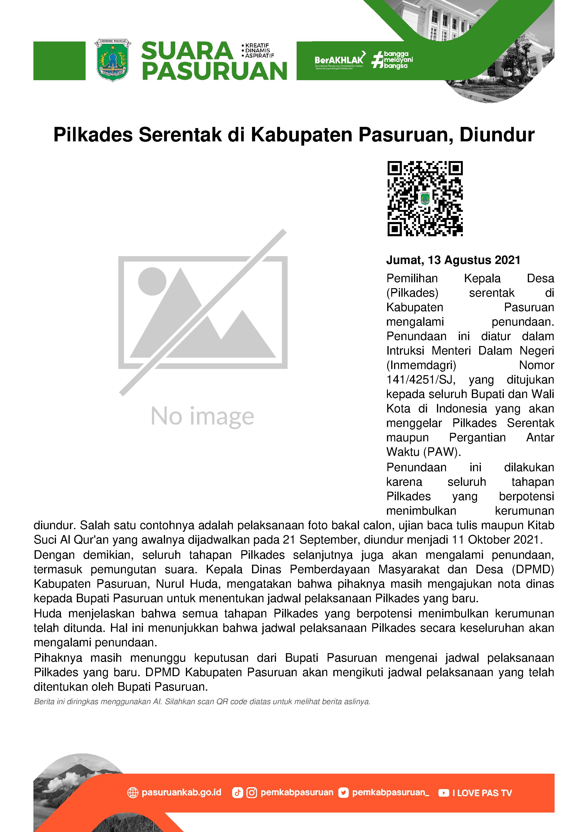Kepala Dinas Pemberdayaan Masyarakat dan Desa (DPMD) Kabupaten Pasuruan, Nurul Huda mengatakan, pengunduran jadwal pelaksanaan pilkades sangat memungkinkan, sebab seluruh tahapan pilkades yang berpotensi menimbulkan kerumunan, dilakukan penundaan.