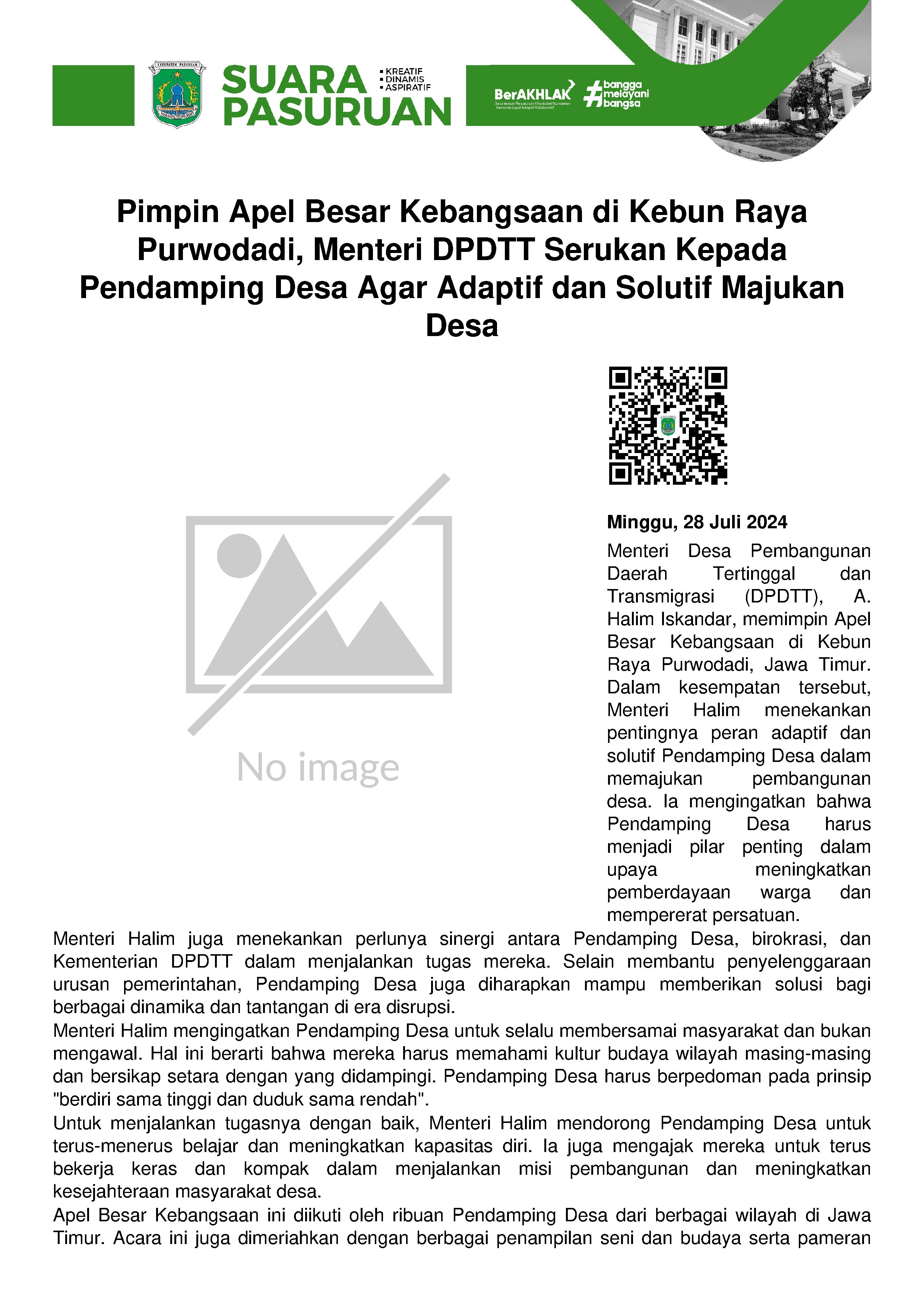 Saat memimpin Apel Besar Kebangsaan bersama seluruh Pendamping Desa se-Provinsi Jawa Timur, Menteri Desa Pembangunan Daerah Tertinggal dan Transmigrasi (DPDTT), A. Halim Iskandar meminta kepada seluruh Pendamping Desa agar adaptif dan solutif dalam memajukan pembangunan Desa. Pernyataan bernada ajakan itu disampaikan di Kebun Raya Purwodadi pada hari Minggu (28/7/2024).