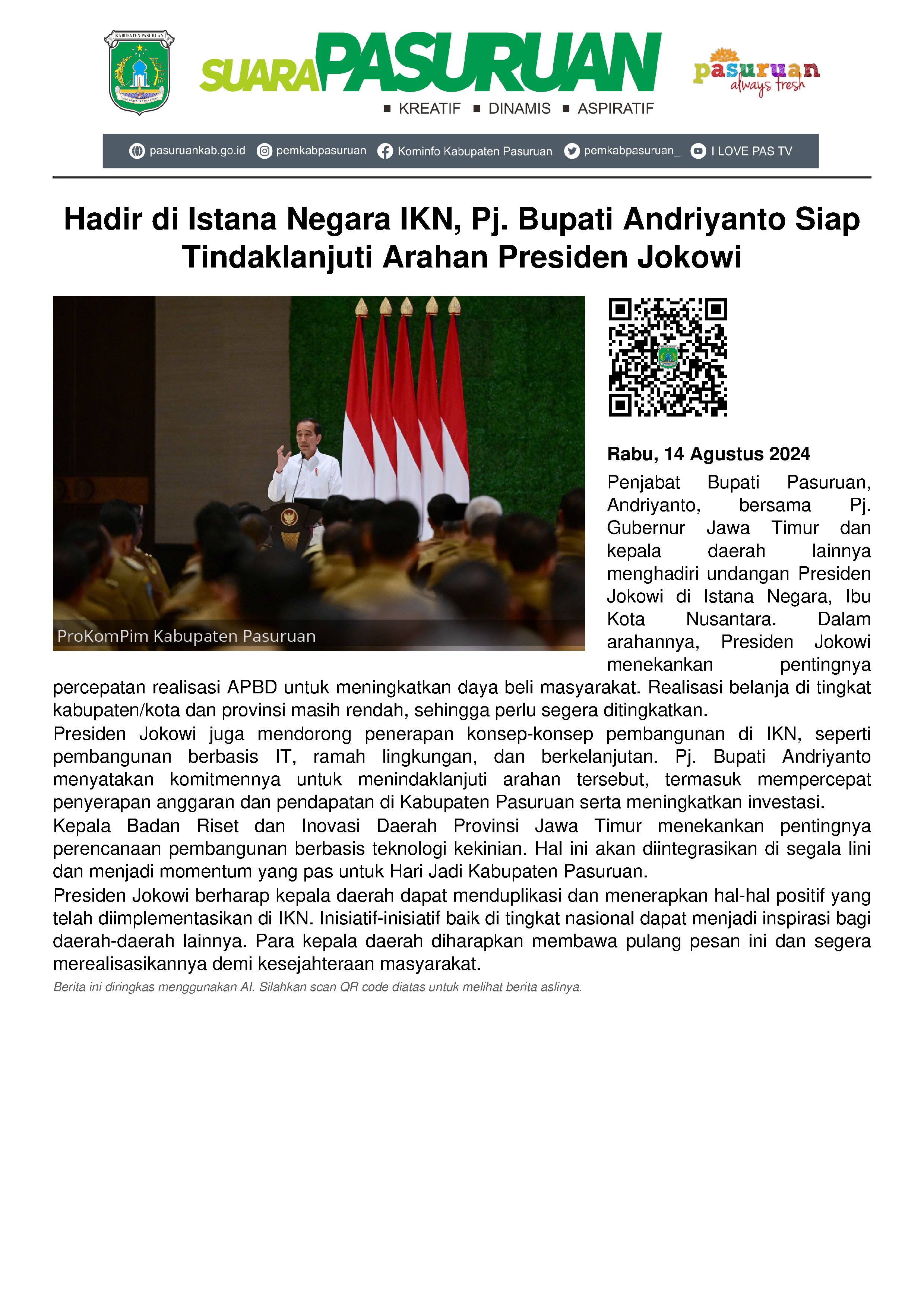 Bersama Pj. Gubernur Jawa Timur, Adhy Karyono dan seluruh Kepala Daerah di tanah air, Penjabat (Pj.) Bupati Pasuruan, Andriyanto menghadiri undangan Presiden Republik Indonesia (RI), Joko Widodo di Istana Negara, Ibu Kota Nusantara (IKN), Provinsi Kalimantan Timur. Acara kenegaraan tersebut dilaksanakan pada hari Selasa (13/7/2024).