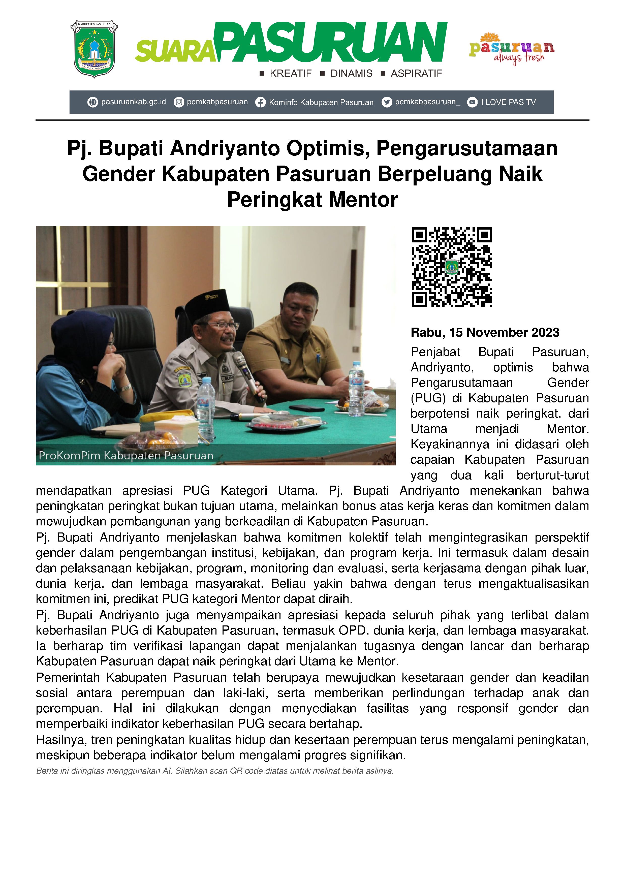 Penjabat (Pj.) Bupati Pasuruan, Andriyanto optimis, Pengarusutamaan Gender (PUG) di Kabupaten Pasuruan berpotensi naik peringkat. Dari yang sebelumnya di posisi Utama menjadi Mentor. Ungkapan keyakinannya itu disampaikannya pada saat hadir dalam Verifikasi Lapangan Evaluasi PUG Tahun 2023 di Kabupaten Pasuruan.