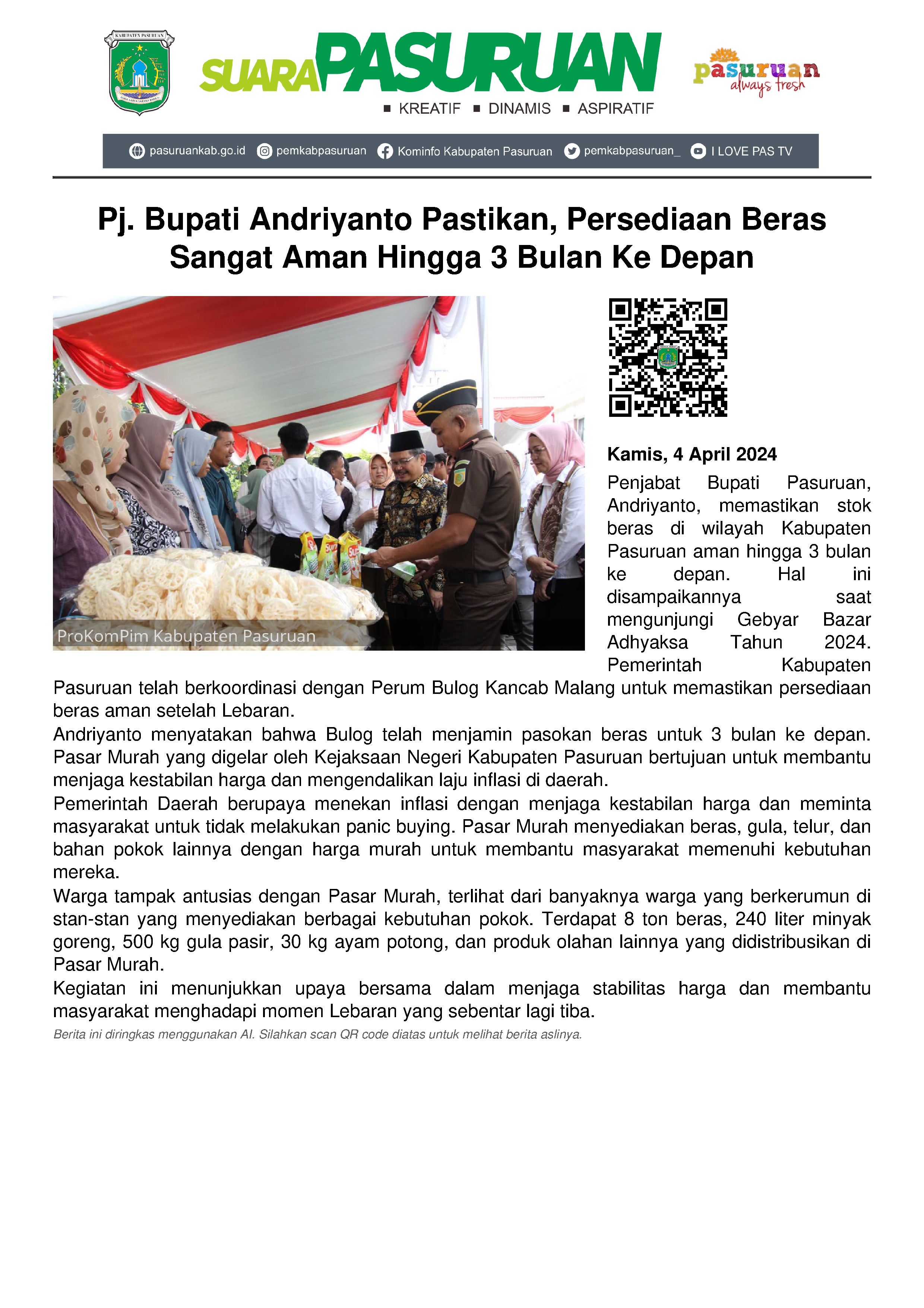 Penjabat (Pj.) Bupati Pasuruan, Andriyanto menegaskan, stok beras di wilayah Kabupaten Pasuruan sangat aman hingga 3 bulan ke depan. Pernyataan itu disampaikannya di sela-sela visitasinya dalam agenda Gebyar Bazar Adhyaksa Tahun 2024.
