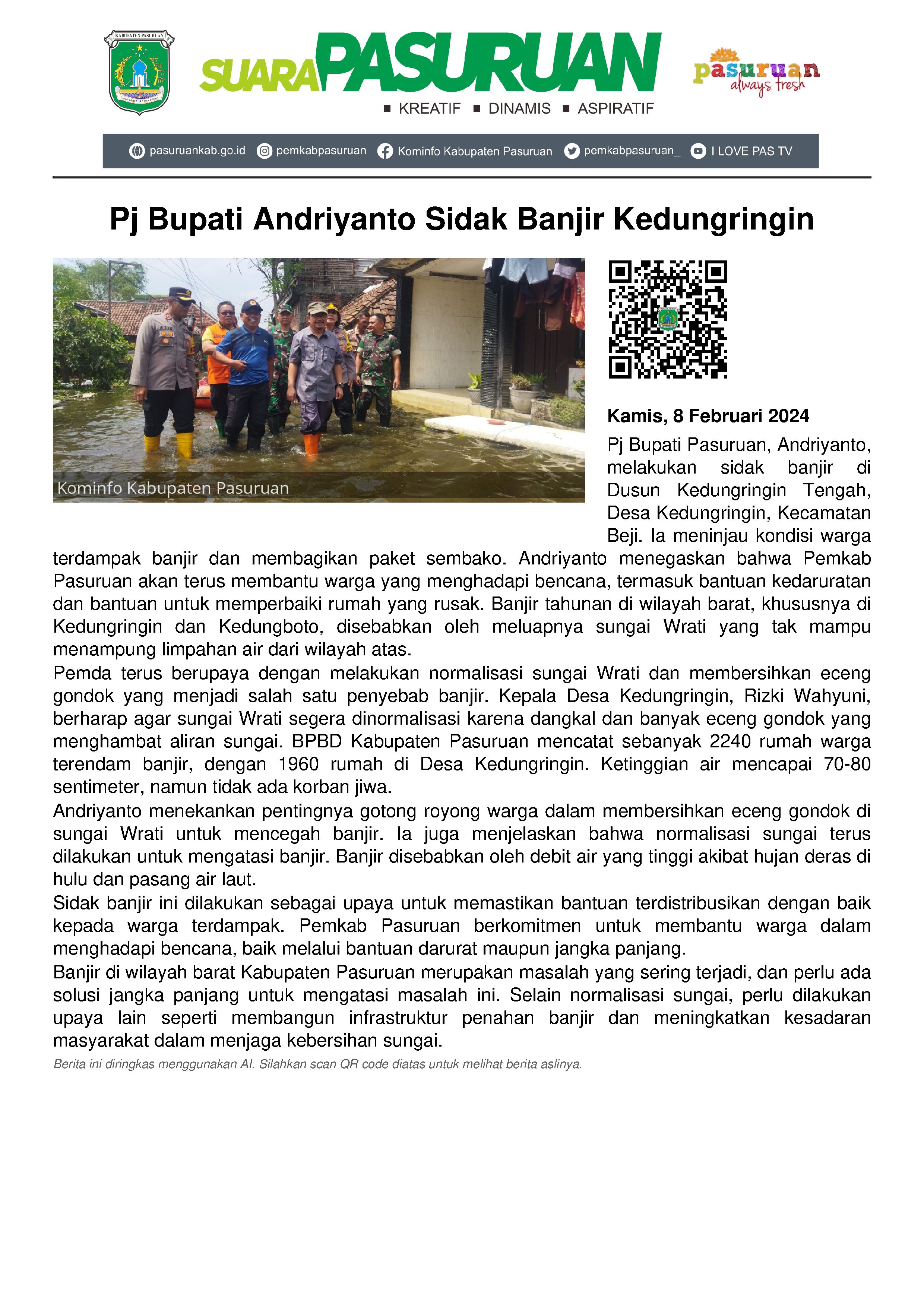 Pj Bupati Pasuruan, Andriyanto menggelar sidak (inspeksi mendadak) banjir di Dusun Kedungringin Tengah, Desa Kedungringin, Kecamatan Beji, Kamis (8/02/2024) pagi.
