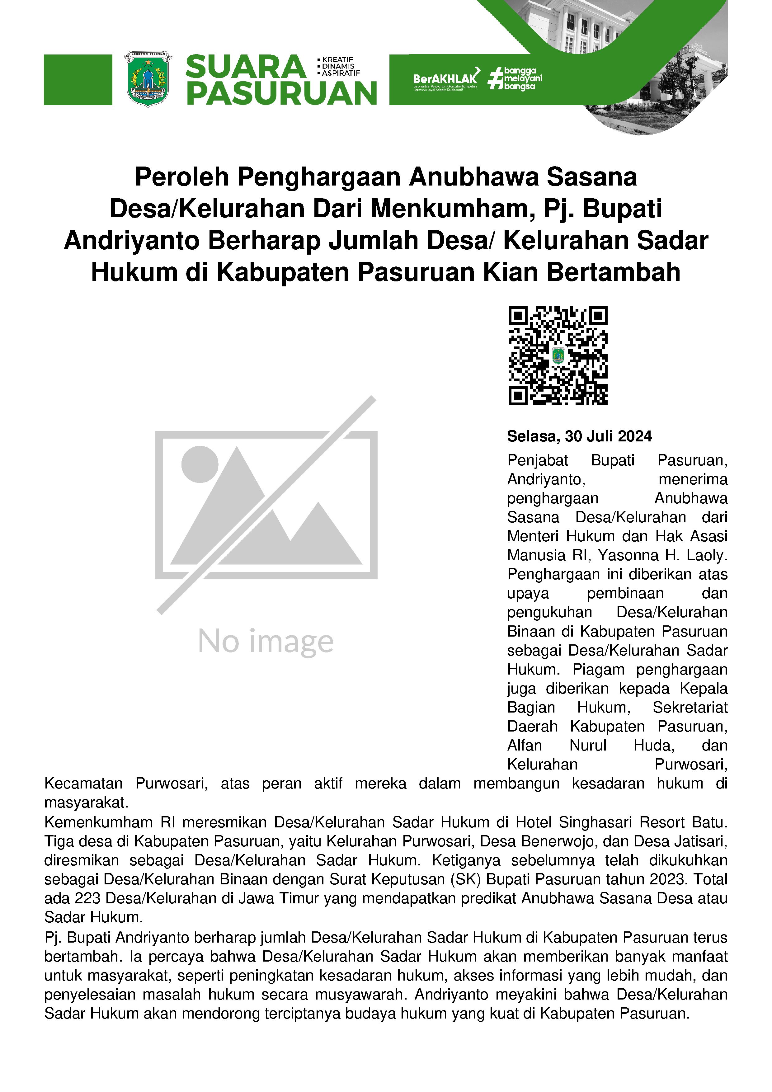 Hari ini, Selasa (30/7/2024), Penjabat (Pj.) Bupati Pasuruan, Andriyanto menerima penghargaan Anubhawa Sasana Desa/Kelurahan dari Menteri Hukum dan Hak Asasi Manusia Republik Indonesia (Menkumham RI), Yasonna H. Laoly. Apresiasi diberikan berkat upaya pembinaan dan pengukuhan Desa/ Kelurahan Binaan di wilayah Pemerintah Kabupaten Pasuruan sebagai Desa/ Kelurahan Sadar Hukum.