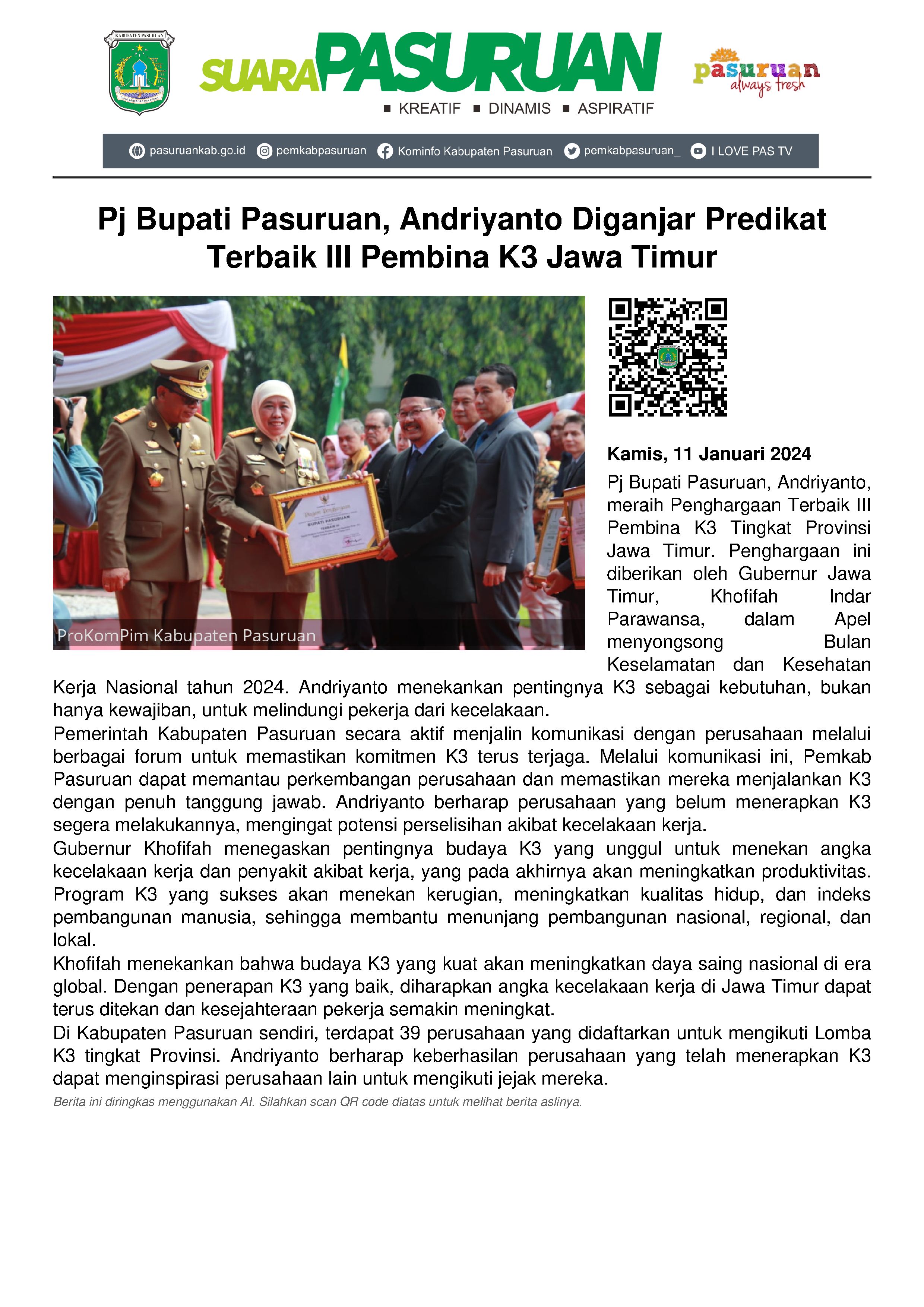 Pj Bupati Pasuruan, Andriyanto meraih Penghargaan Terbaik III Pembina K3 (Keselamatan dan Kesehatan Kerja) Tingkat Provinsi Jawa Timur.Â