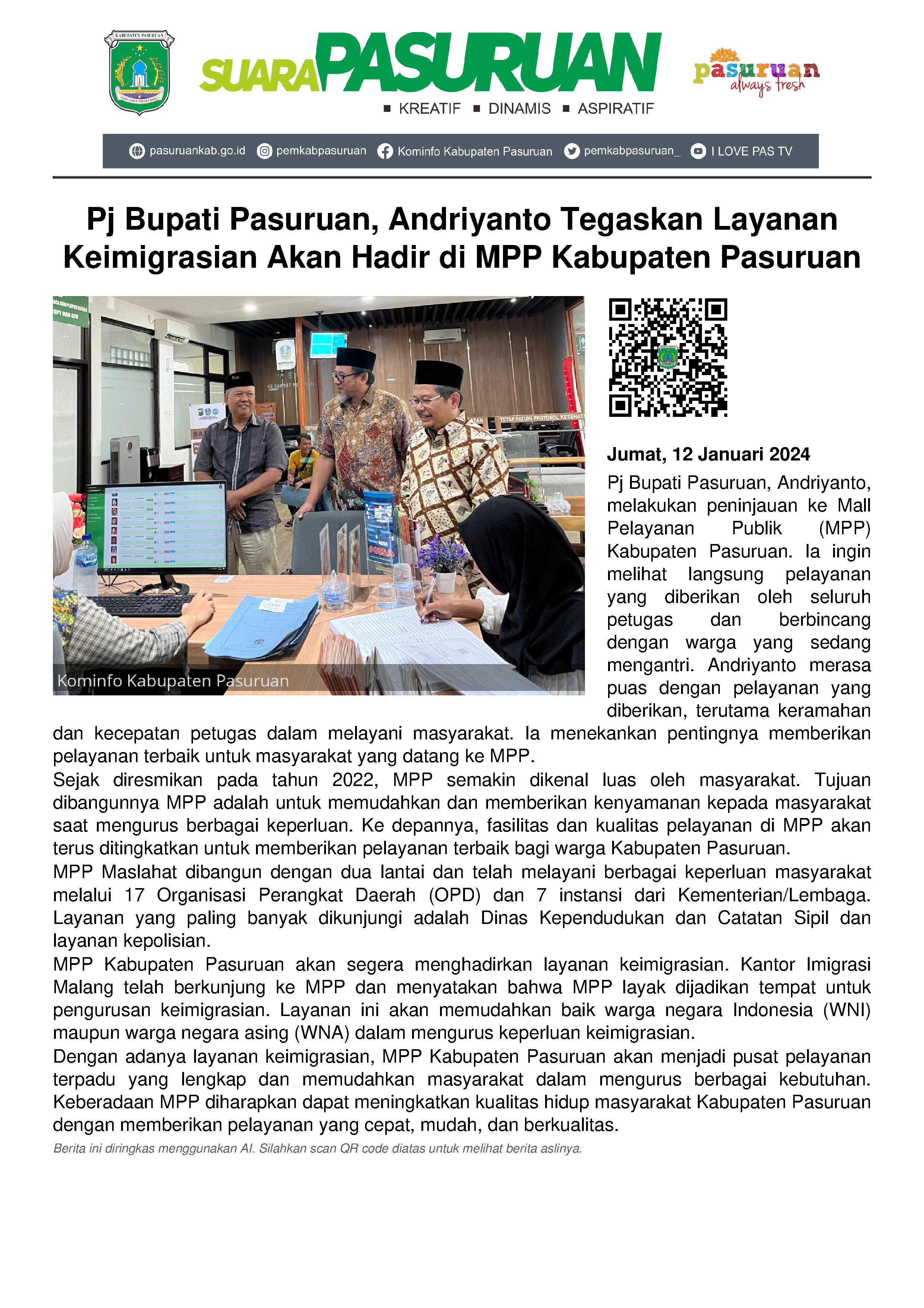"Baik untuk WNI maupun WNA. Mudah-mudahan dalam waktu yang tidak lama, layanan keimigrasian ada di MPP Kabupaten Pasuruan," (emil)