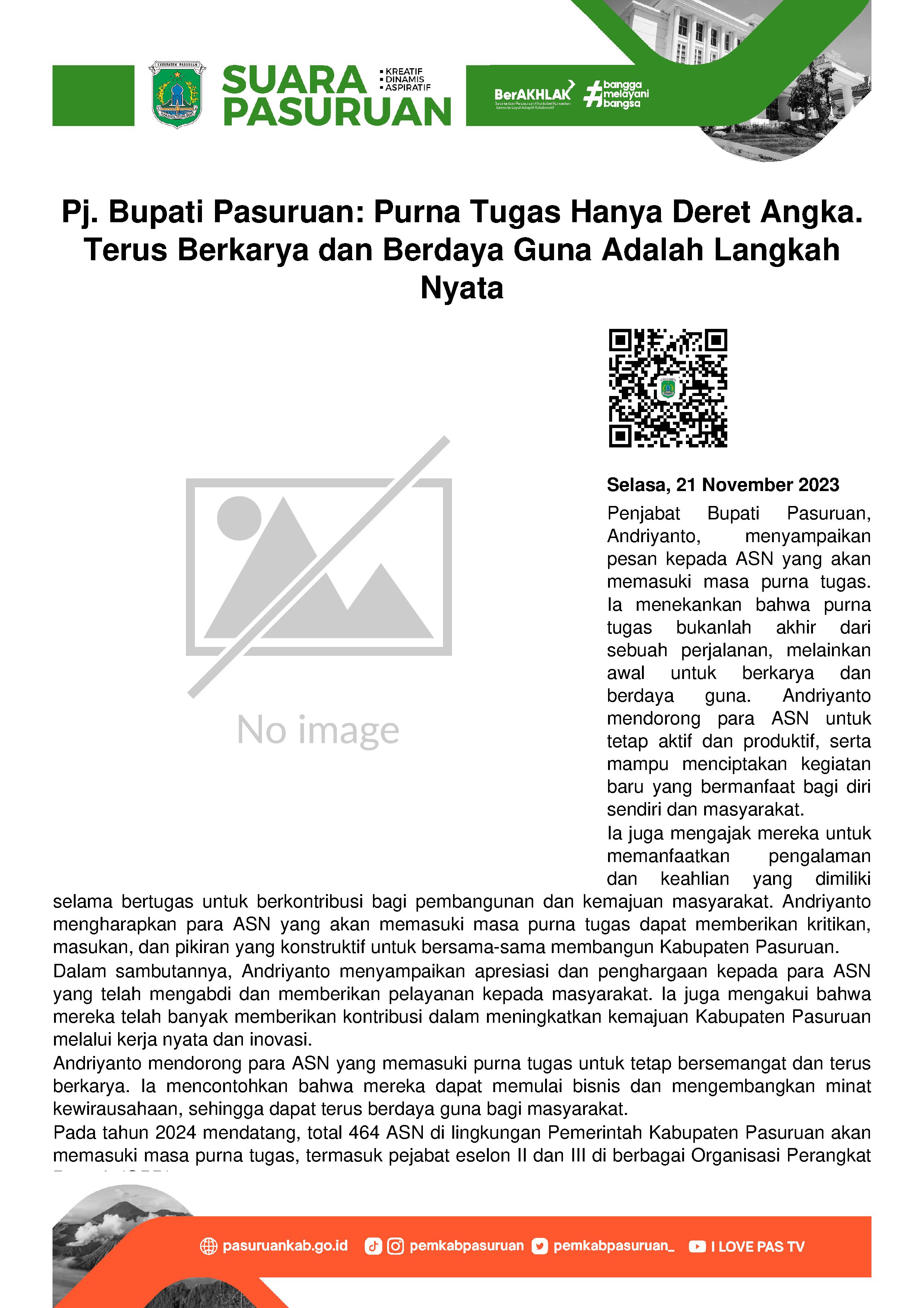 Dalam arahan yang disampaikannya pada saat Pembekalan ASN Menjelang Purna Tugas di Lingkungan Pemerintah Kabupaten Pasuruan Tahun 2023, Pj. Bupati Pasuruan mengajak seluruh ASN yang akan memasuki masa purna bakti agar tetap aktif dan produktif, sehat dan bahagia. Serta mampu menciptakan kegiatan baru yang bermanfaat bagi diri sendiri dan masyarakat.